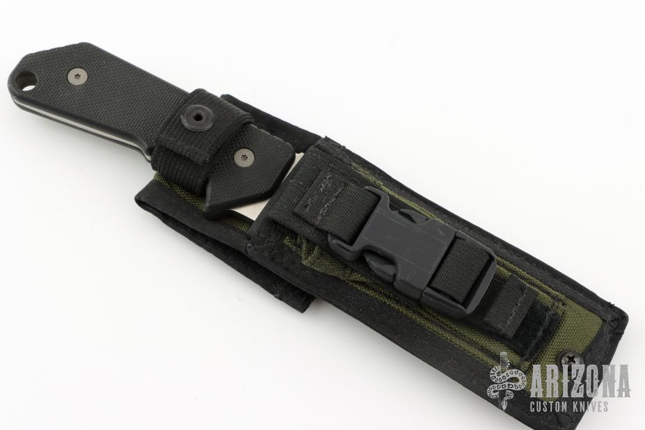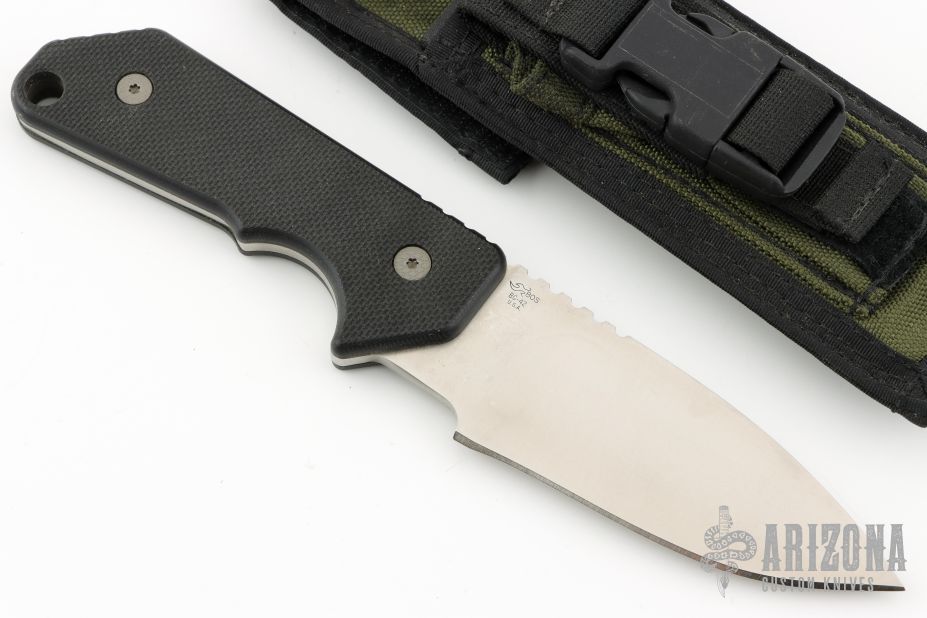 This Buck/Strider collaboration features a satin finished drop point blade with notched thumbrest, .180" blade stock and 1.780" blade depth, full tang construction. The handle has textured black G-10 scales with a lanyard hole. Comes with nylon sheath and original box. Excellent condition.