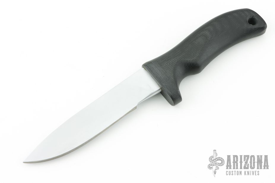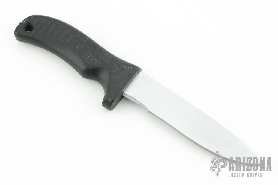 This Baby Mako by MadDog Knives features blade with .250" stock and .997" blade depth, hidden tang construction. Selectively tempered, the ATAK has a Rockwell C-scale hardness of 62 at the edge (as hard as a file), and HRC 50-54 throughout the spine and hidden full tang. Hard chrome blade finish. The black G-10 handle is designed to be ergonomic and has the ability to withstand tremendous punishment with little or no damage. It is hard and tough enough to be used as an impact tool. Has been used and sharpened, otherwise excellent condition.