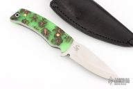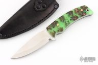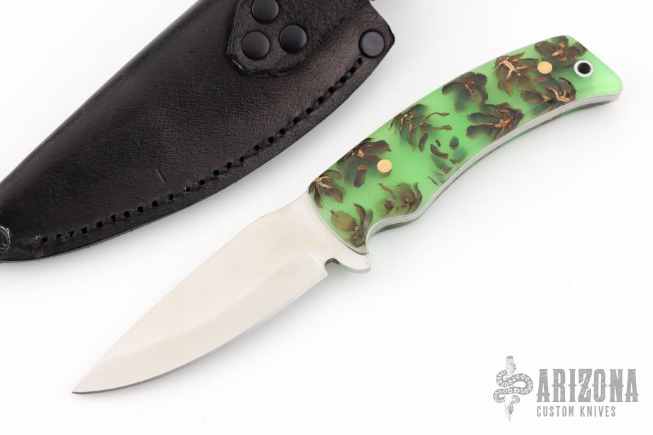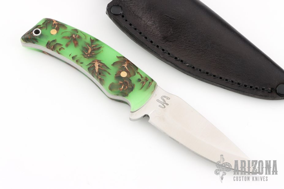 This knife by Smoky Steel Knives features a satin finished blade with .145" blade stock and 1.163" blade depth, full tang construction. The handle has stabilized pine cone scales with brass pins. Comes with a black leather sheath and COA. New from maker.