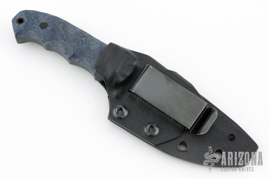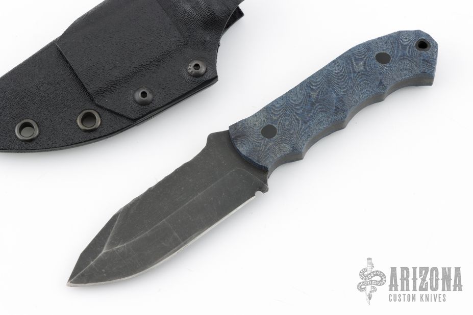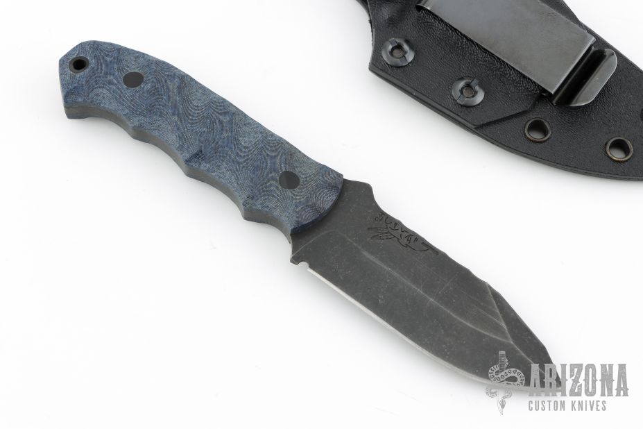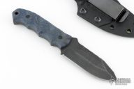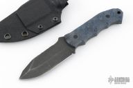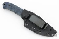 This Disaster Cub by Half Face Blades features a dark stonewashed drop point blade with a rock worked spine and full tang construction, .152" blade stock, 1.140" blade depth.  The handle has contoured blue denim micarta scales with black pins.  Comes with a Kydex sheath. Has some scuffs and scratches, otherwise good condition.