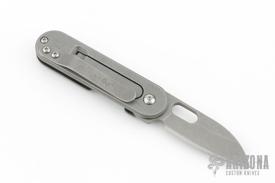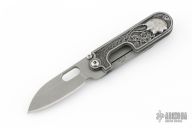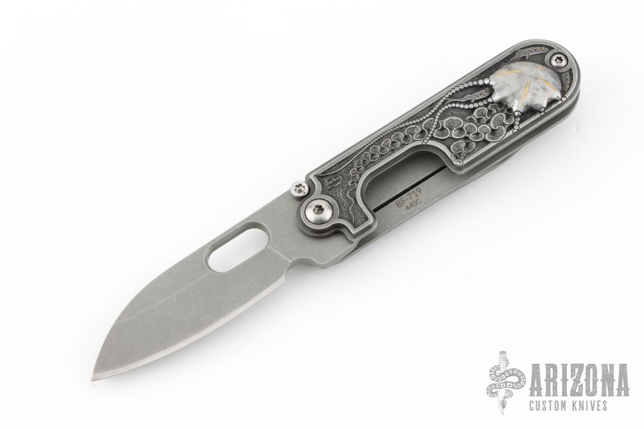 This Black Fox Bean was embellished by Tom Sterling, it features a tumble finished blade with thumbhole. The handle has a 440C stainless steel frame with a 420J2B stainless steel clip. The front is engraved with a "Jellyfish" and has 24kt gold inlays. Comes with original box and COA. New from Tom Sterling.