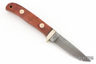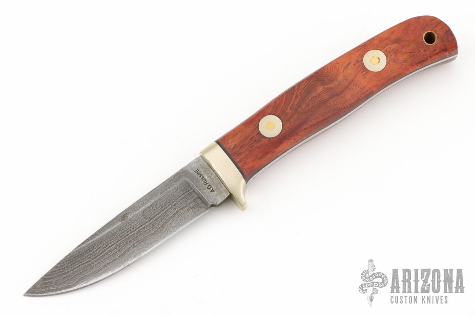 This Bird and Trout by AG Russell features a drop point Damascus blade, .115" blade stock and .727" blade depth, hidden/frame tang construction. The handle has nickle silver guard, and wood scales with black liners/spacers and brass and nickel silver pins with brass tube lanyard hole. Comes with a note from AG Russell, the knife was wrapped in the printed note, and a couple of the letters transferred over to the wood. I'm sure it could be removed. Has a couple light scratches, otherwise excellent condition.
