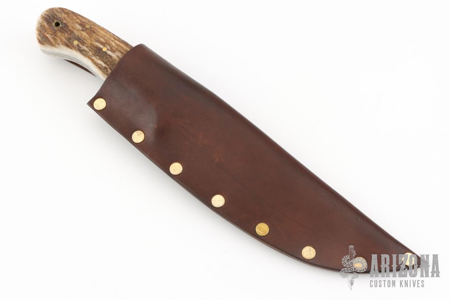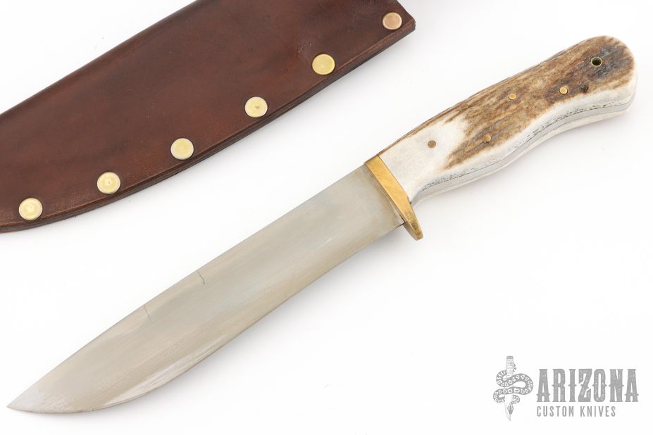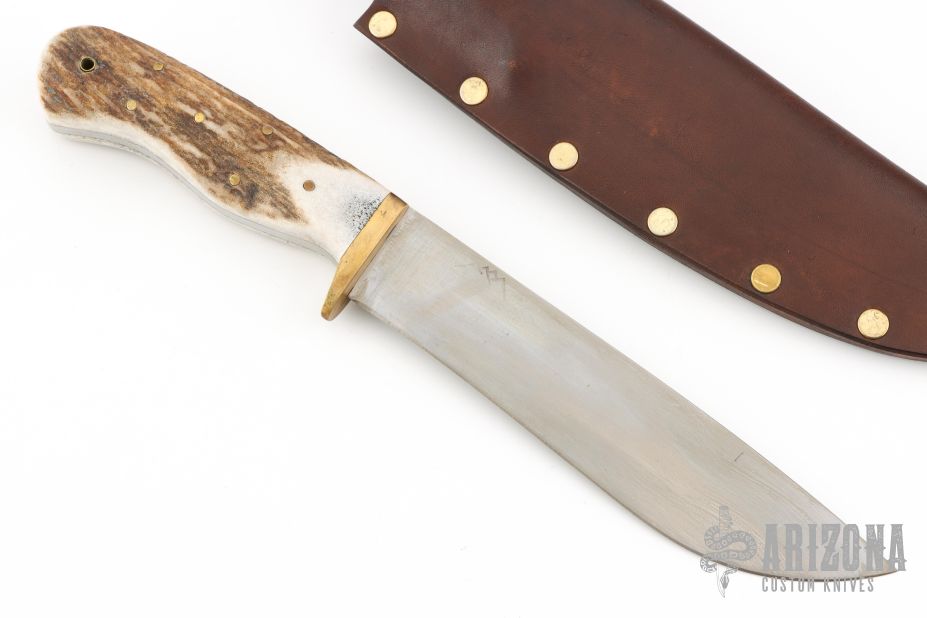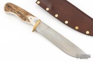 This knife by Idaho Knife Works features a satin finished drop point blade, .216" blade stock and 1.451" blade depth, full tang construction. The handle has a brass guard and elk horn scales with brass pins. Comes with a brown leather sheath. Has seen some light oxidation, good condition otherwise.