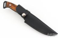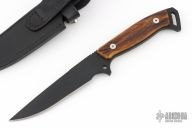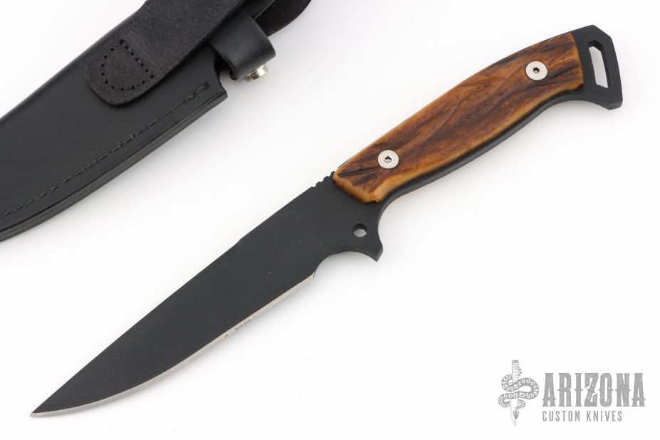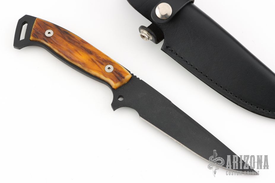 This Fighter by John Greco has a black coated blade with notched thumbrest and false top edge, .208" blade stock and 1.190" blade depth, full tang construction. The handle has carved bone scales. Comes with black leather sheath. Excellent condition.