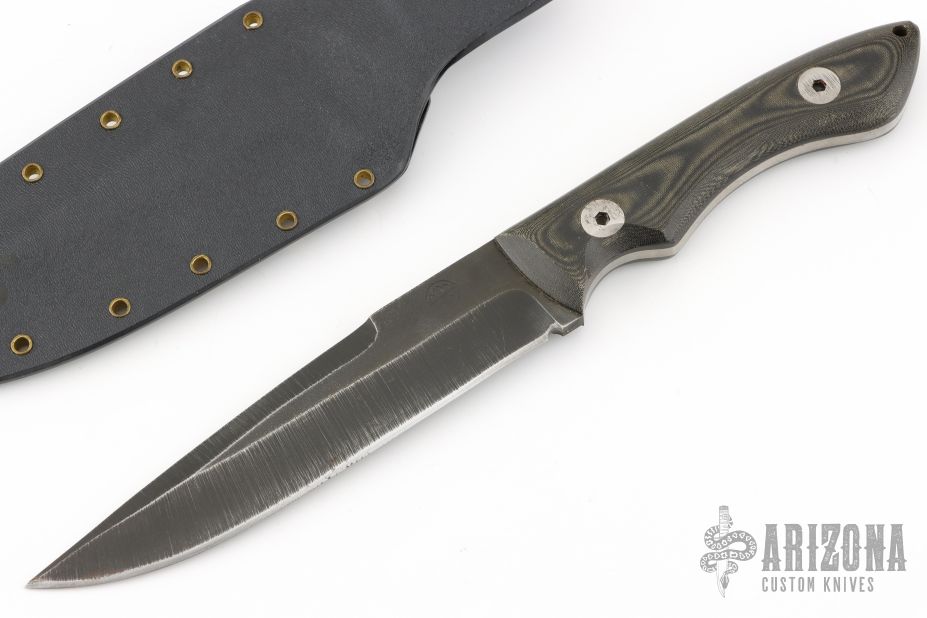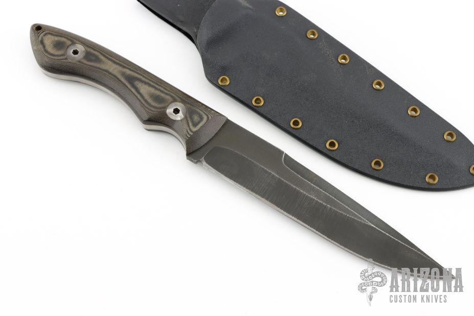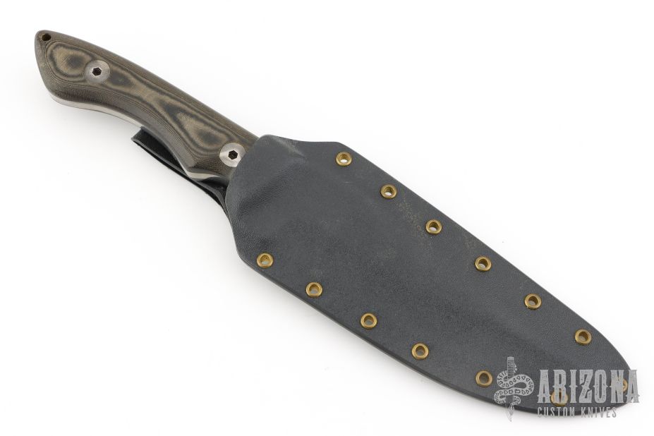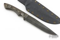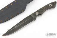 This knife by MMHW features a black blade with false top edge, .217" blade stock and 1.362" blade depth, full tang construction. The handle has black linen micarta scales with lanyard hole at the butt. Comes with kydex sheath. Has some light scuffs and some light oxidation spots, otherwise excellent condition.