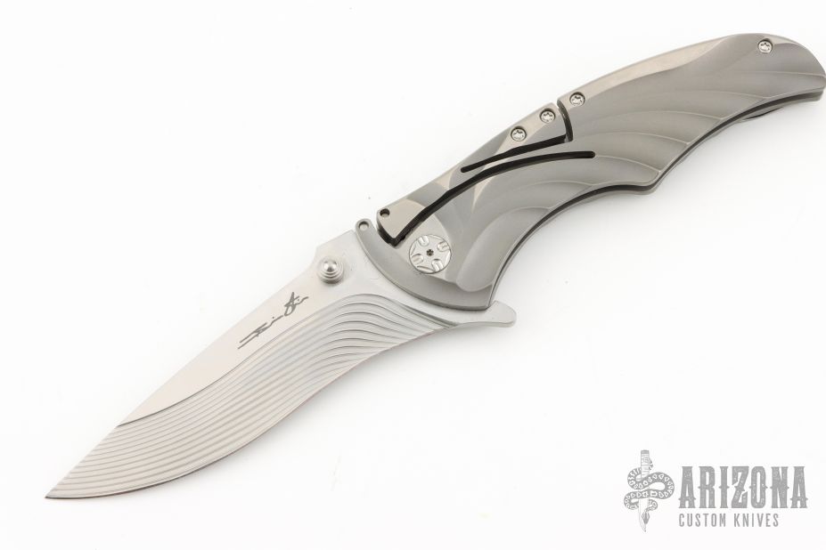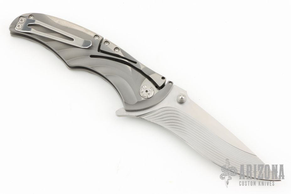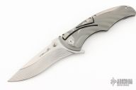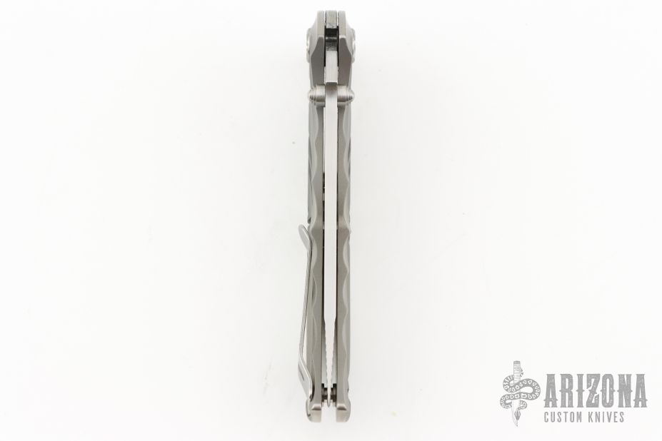 This knife features a mirror and satin finished blade with dual thumbstuds and flipper. The handle has a milled titanium frame with an integral lockback mechanism and tip up stainless steel clip. Comes with a nylon zippered case. Excellent Condition.
