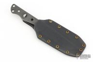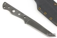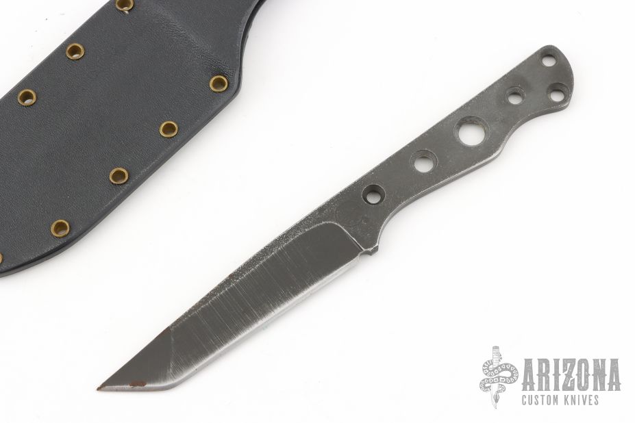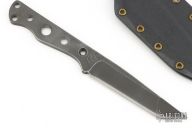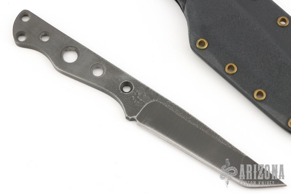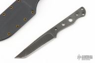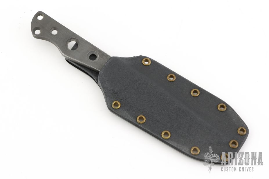 This fixed blade from Mineral Mountain Hatchet Works features a tanto blade with swedge. The handle is comprised of skeletonized steel. Includes kydex sheath. Has some oxidation spots, otherwise good condition.