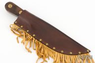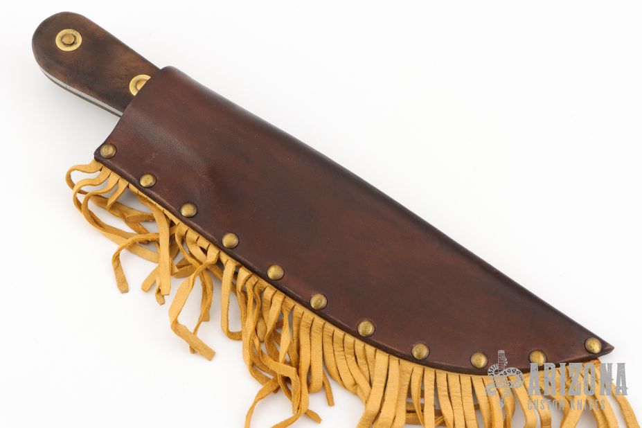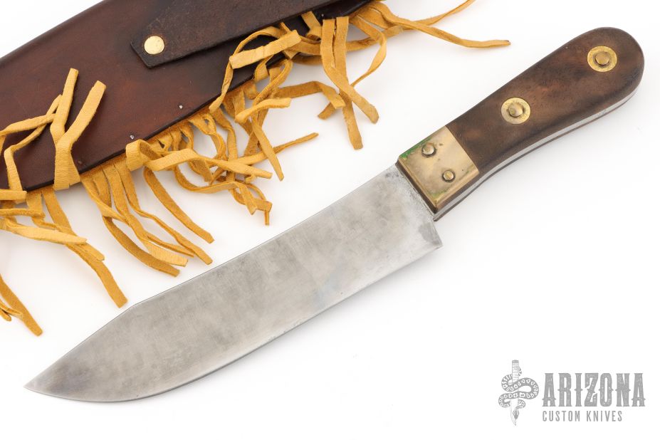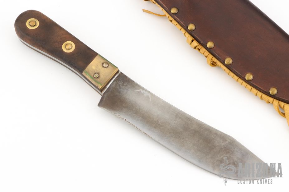 This Buffalo Hunter from Mike Mann and Idaho Blade Works features a flat ground blade with .224" blade thickness and 1.634" blade depth, full tang construction. The handle has wood scales and inlaid brass bolsters and brass pins. Includes a brown leather sheath with belt loop. Has some scuffs and scratches, has a couple small oxidation spots, otherwise good condition.