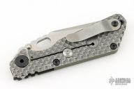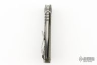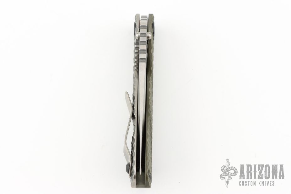 This SNG DGG by Strider has a satin/stonewash finished Bowie blade with dual thumb studs, thumb hole, and notched thumb rest. Handle has a dirty olive G-10 and bead blasted titanium "Gunner Grip", lockbar stabilizer, and titanium tip up clip. Nice detent, lockup and blade seating. New Conditon.