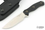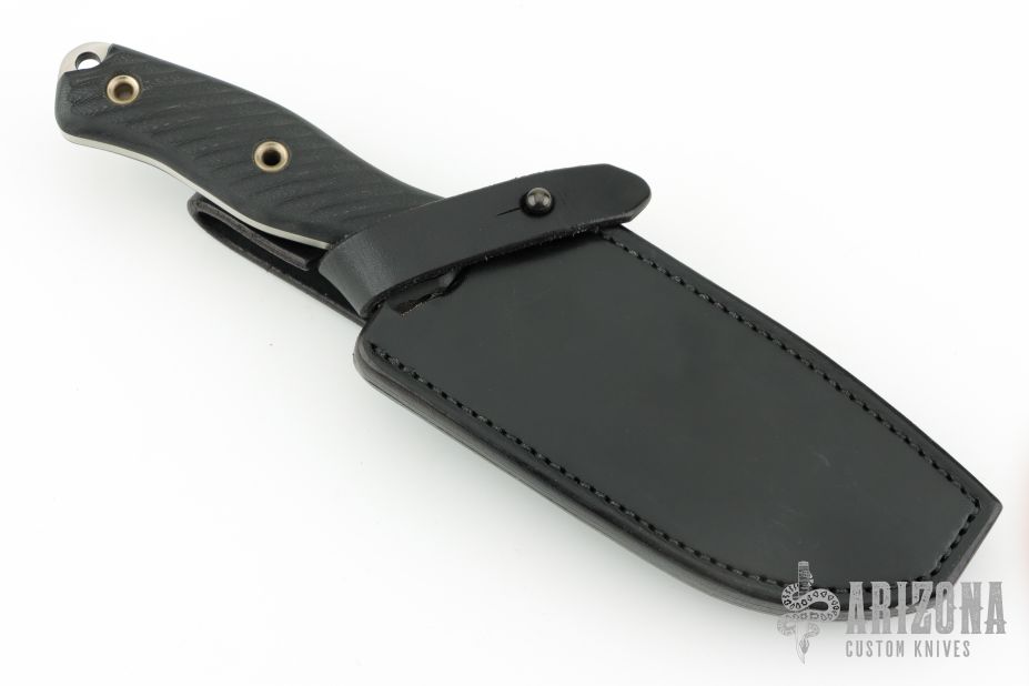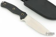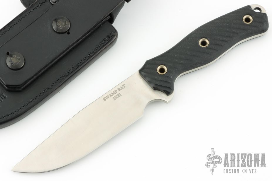 This INFIdu by Swamp Rat Knives features textured and contoured black G-10 scales. The drop point blade is made from INFI Steel with a full tang construction. .180" Blade Stock 1.383" Blade Thickness. Comes with a custom black leather sheath by Pirtle Made. Excellent condition.