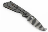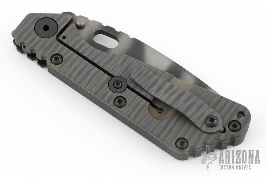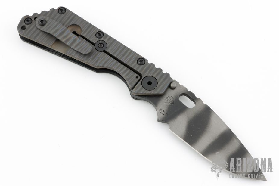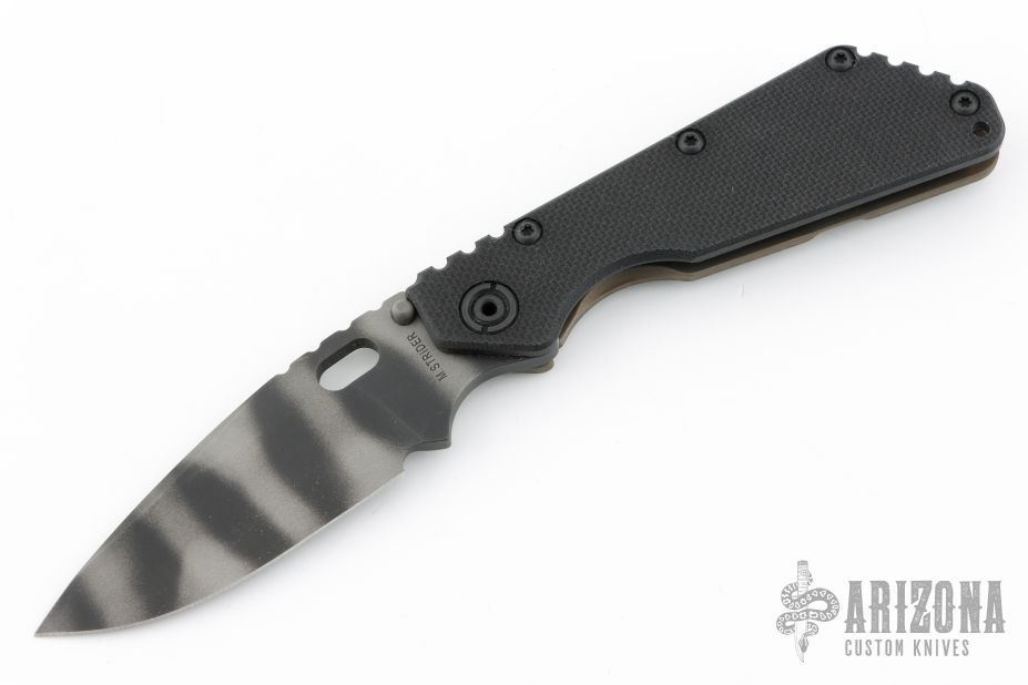 This SMF from Strider Knives features a tiger stripe blade and textured black G-10 and flamed titanium handle and matching tip up titanium clip. Notches on thumbrest, rear of handle, and lockup. Includes Hinderer "Lock Bar Stabilizer" for maximum reverse lock retention. Excellent condition.