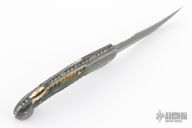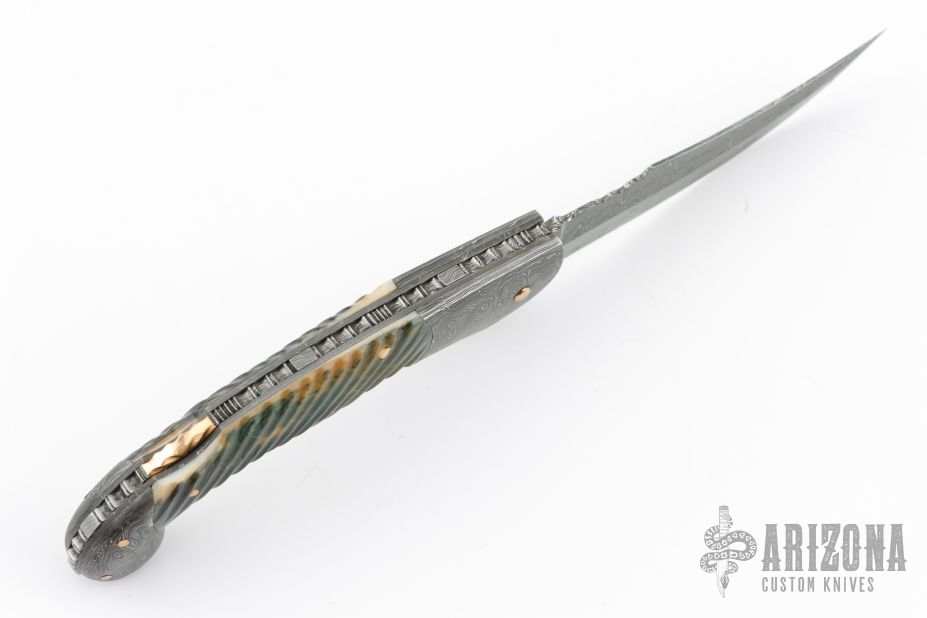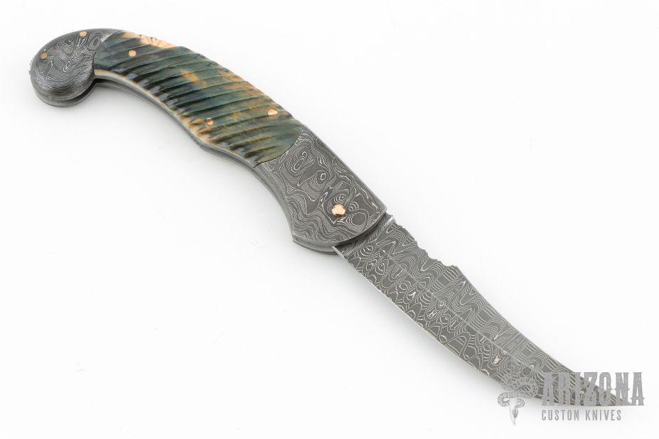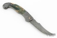 This is a mini-Persian lockback folder by Joe Kious features a Damascus blade with nail nick and fileworked spine. The handle has Damascus bolsters, fluted mammoth ivory scales, gold pins, darkened steel liners, fileworked Damascus backspacer with fileworked gold lock release. Nice lockup and blade seating. Comes with a zippered case. Excellent condition.