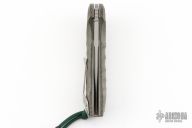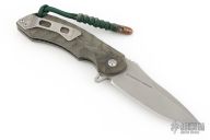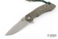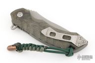 This custom Mike Vagnino designed flipper from Olamic Cutlery features textured bgreen micarta scales. Bead blast tumble finish blade with notched spine and flipper tab. Tip up titanium clip, titanium liners, matching titanium backspacer. Great action that requires no wrist movement. Early and strong lock up and nice detent. Comes with a zippered case, Serial # W124. Excellent Condition.
