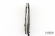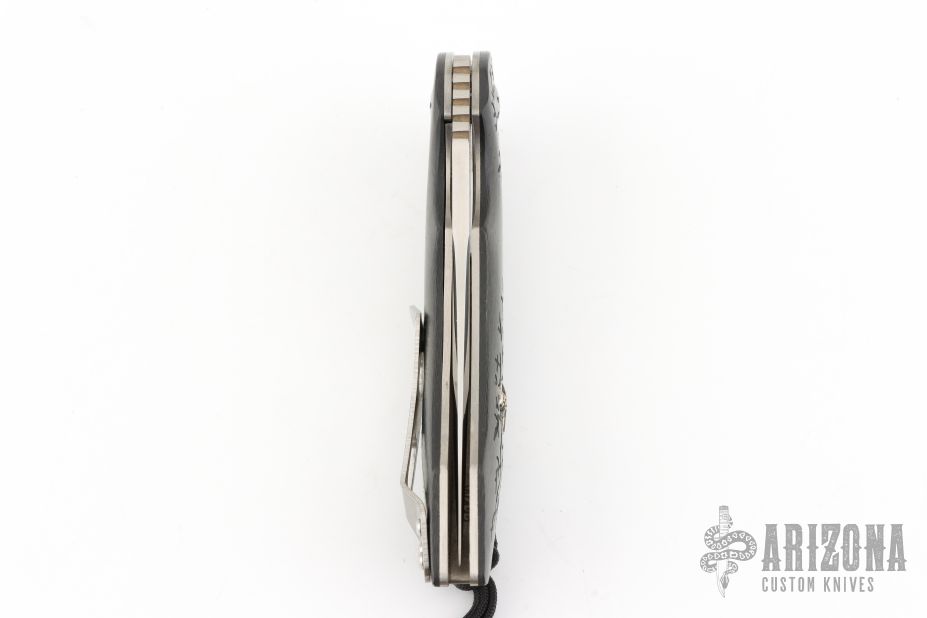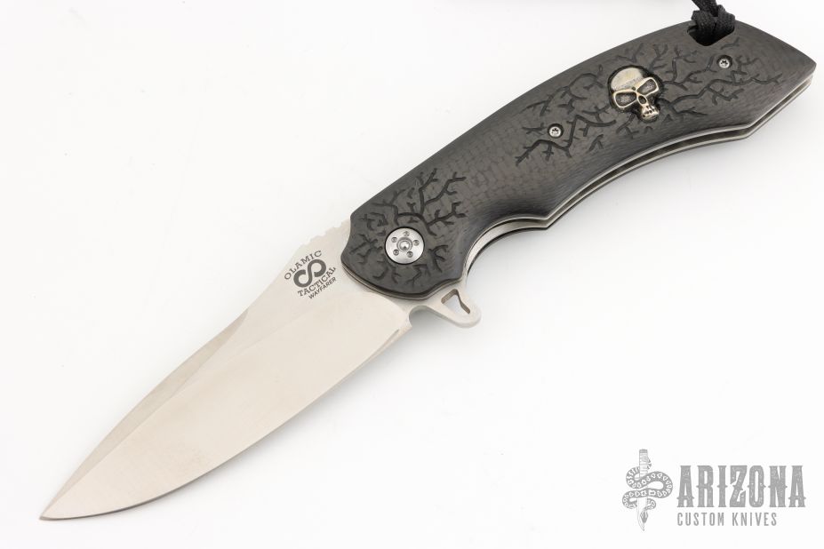 This Wayfarer W461 by Olamic Cutlery features a satin finished drop point blade with swedge, notched thumb ramp and flipper. The handle has carbon fiber scales with skull inlay over satin finished titanium liners and backspacer, polished stainless steel tip up clip. Lanyard hole in pommel. Comes with zippered case, black leather sheath, COA dated 06-09-14. Excellent condition.
