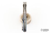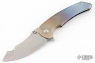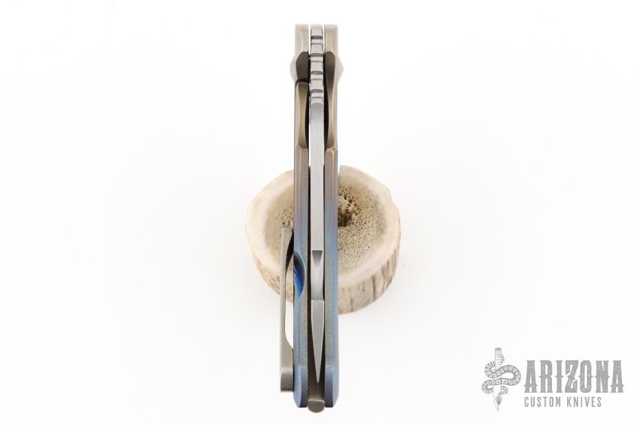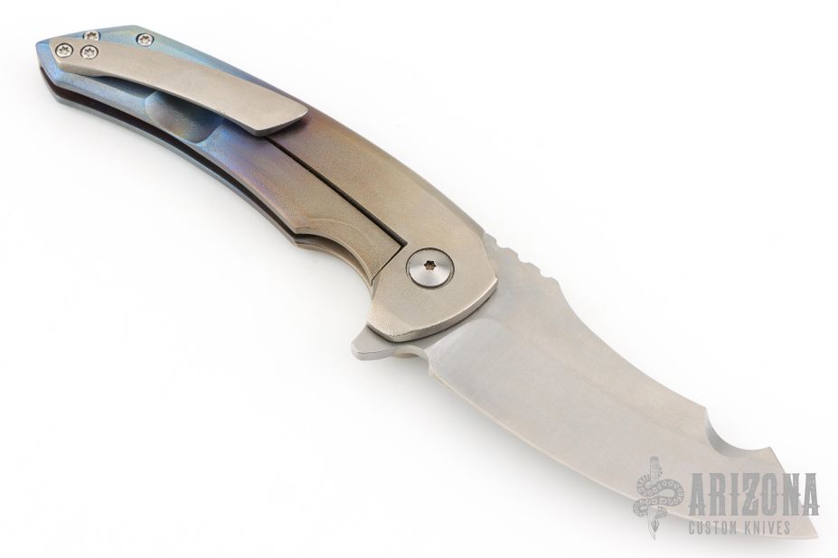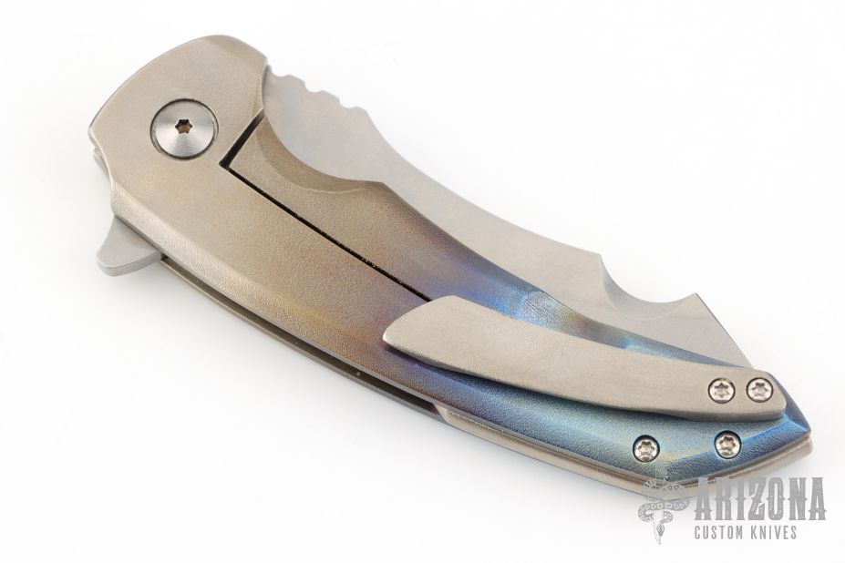 This Framelock flipper by Christensen Knifeworks features a stonewashed blade with a notched thumbrest. The handle has an orange peel finished anodized titanium frame with a matching tip-up pocket clip.  Includes a padded zippered case and COA.  Excellent Condition.