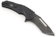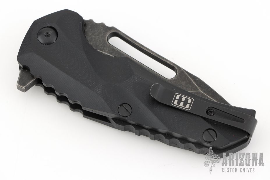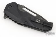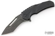 "Introducing The New Reloader Flipper, A collaborative design between custom knifeakers Jason Brous and Mikkel Willumsen. The black cerakote finished D2 steel blade features a unique main hollow grind with a flat ground tanto style tip and a thick secondary swedge on each side. The Reloader utilizes an integrated flipper for quick blade deployment on a ball bearing pivot system. The handle scales and backspacer are made from black G-10 with custom milled grooves for a secure and comfortable grip. The titanium liner lock is carbidized with tungsten carbide which provides a harder lock face surface and eliminates stickiness. The knife can be deployed either with the flipper tang or manually with the groove cut out in the blade. With stainless steel hardware and a reversible, deep set, tip up pocket makes this knife a great affordable every day carry blade." Excellent Condition.