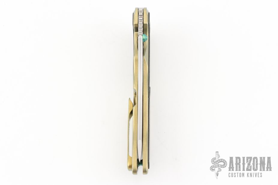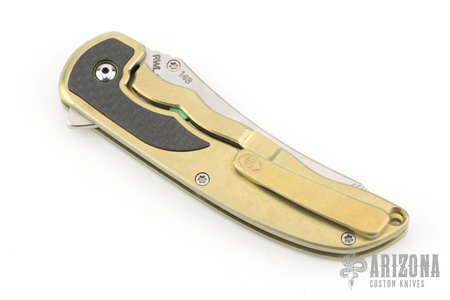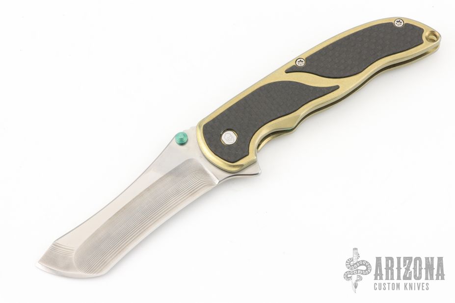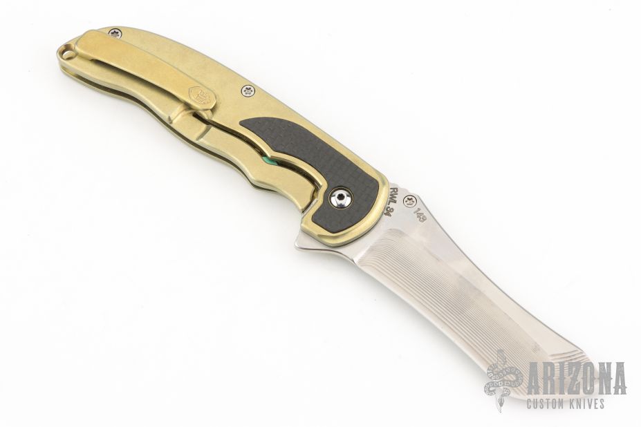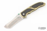 This Norseman Flipper from John Grimsmo features a satin finished blade with a single thumbstud, notched thumbrest and a flipper. The handle has a gold stonewashed titanium frame with carbon fiber inlays, tip up titanium clip with hidden screws. Smooth action that requires no wrist movement. Nice detent, lockup and blade seating. Includes a padded zippered case.  Excellent Condition.