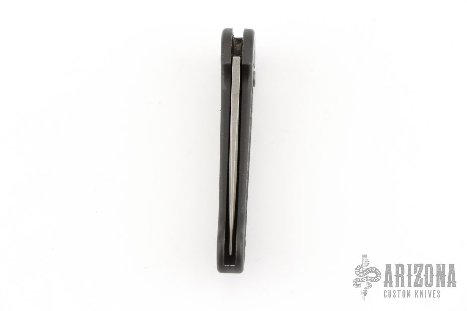 This Mini UDT by Microtech has a green partially serrated blade. The handle is black aluminum with non-slip inserts. Side opening coil-spring automatic. Dated 12/2002 and s/n 3369. Has some scuffs, has some wear on the blade edge, otherwise good condition.