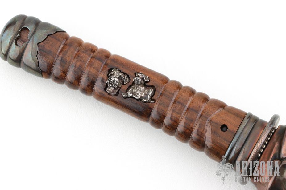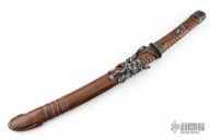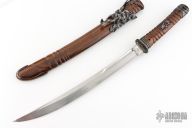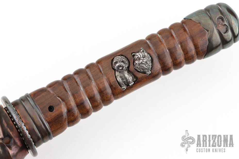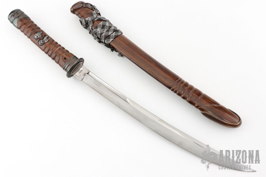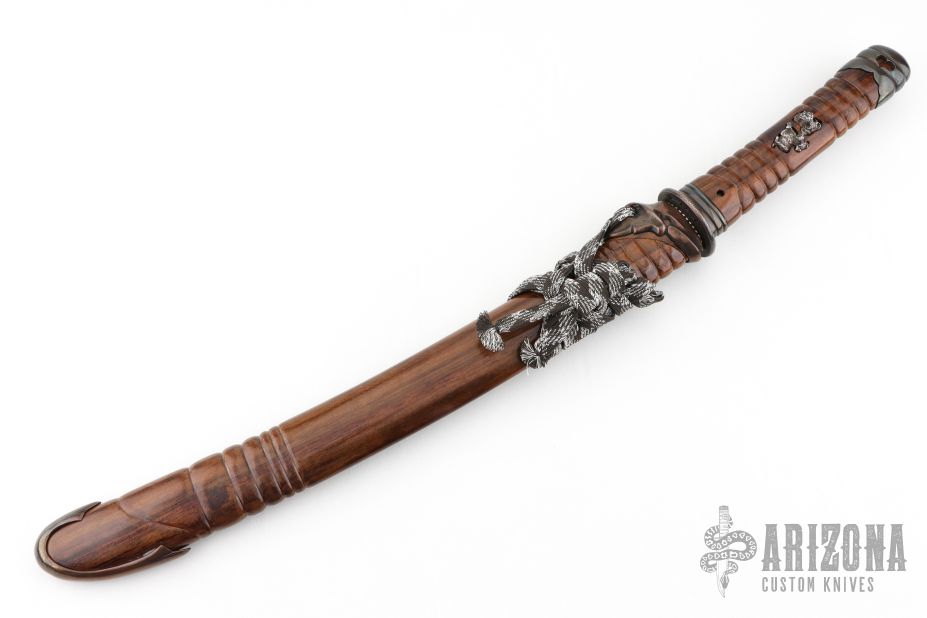 This Wakizashi by David Goldberg features a hand rub satin finished upswept blade with hamon and fullers, .279" blade stock and 1.155" blade depth, hidden tang construction. The handle has an engraved sterling silver habiki and seppas, carved and hammered copper tsuba, carved wood tsuka with inlaid sterling silver menukis, darkened silver fuchi and kashira. Comes with a matching carved wood saya with carved copper fittings. Excellent condition. Comes with a sword bag.