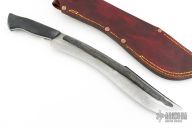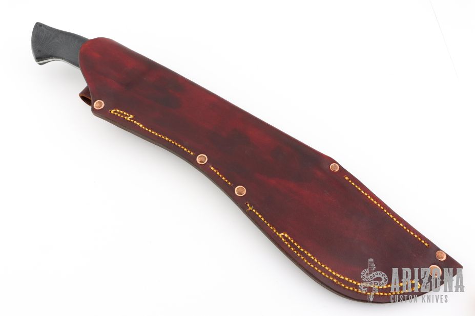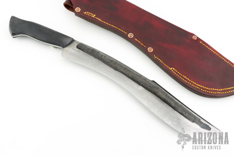 This Chopper by Matthew Danitz features a hand forged Damascus blade with forged fullers and false top edge, .219" blade stock and 2.217" blade depth, full tapered tang construction. The handle has black canvas micarta scales with black G-10 pins. Comes with a zippered case and a brown leather sheath with copper rivets and yellow stitching. New from maker!