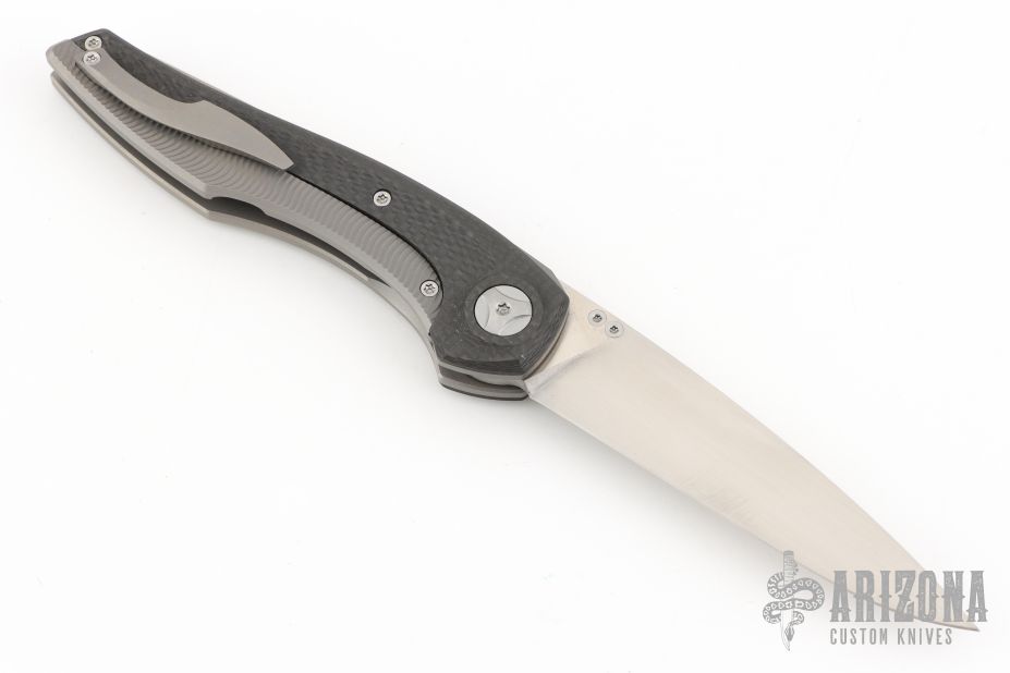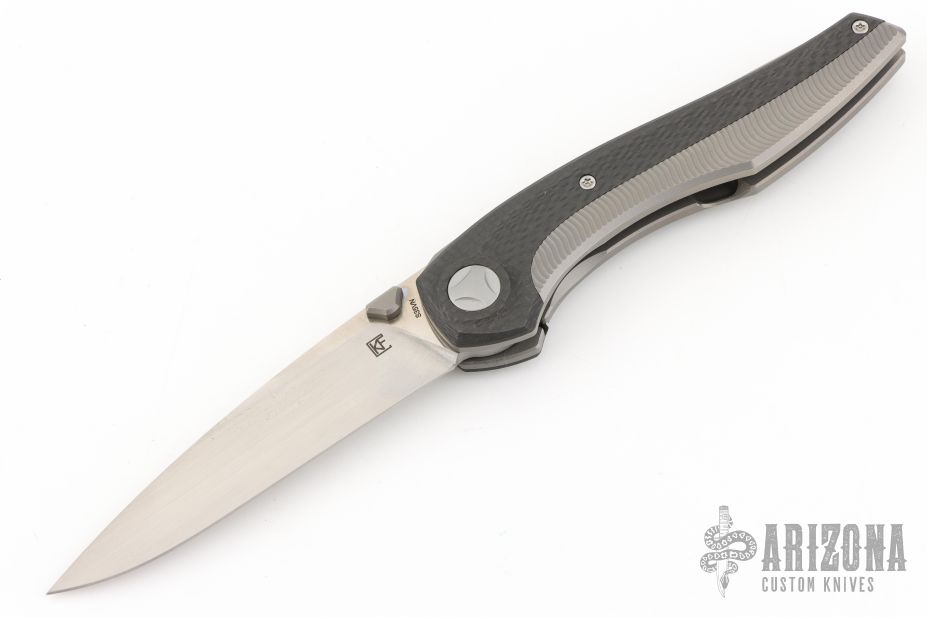 This Sukhoi from Custom Knife Factory features a satin finish drop point blade with titanium titanium thumbstud. The handle has carbon fiber and titanium scales over titanium backspacer. Matching tip up clip. Includes a padded zippered case with COA.  Excellent Condition.
