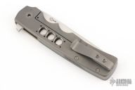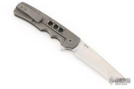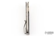 This Tanto Flipper by Jason Clark features a satin-finished tanto blade with a false top edge and checkered flipper. The handle has a mokume dovetailed bolster, carbon fiber scales over a tumbled titanium frame, checkered stainless steel backspacer, and a tip up titanium clip. Runs on IKBS bearings. Nice detent, lockup and blade seating. Amazing flipping action. Includes a zippered case and COA.  Excellent Condition.