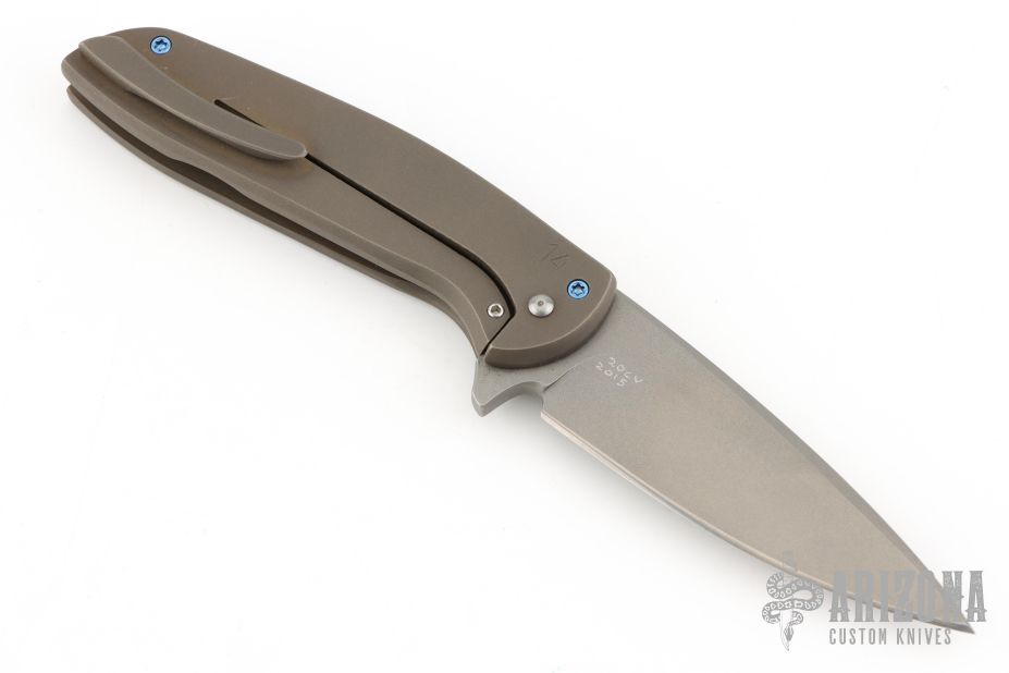 This Stinger by Ferrum Forge features a bead blasted drop point blade. The handle has a titanium frame with a matching tip up pocket. Nice detent, lock up and blade seating. Includes a padded zippered case. Excellent Condition.