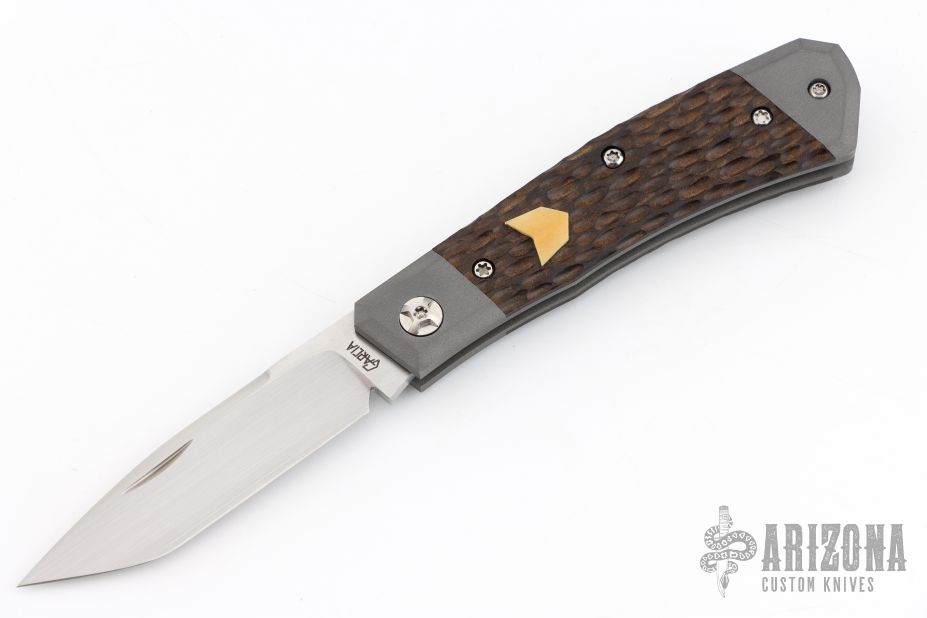 This Sultan slipjoint by Javi Garcia features a hand rub satin-finished blade with nail nick. The handle has a bead-blasted integral titanium frame, jigged Westinghouse paper micarta covers, Westinghouse paper micarta shield.  Half-Stop flush in all positions.  Includes padded zippered case. Excellent Condition.