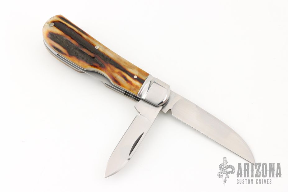 This 2-blade from Enrique Pena features hand-rubbed, satin finished blades with nail nicks. Springs on both blades are flush in the closed, half-stop, and open positions. Both blades sit centered in the handle in the closed position. Nice walk and talk. Stag covers with polished fluted stainless bolsters. Excellent condition. Comes with a zippered case.