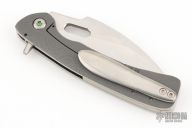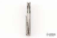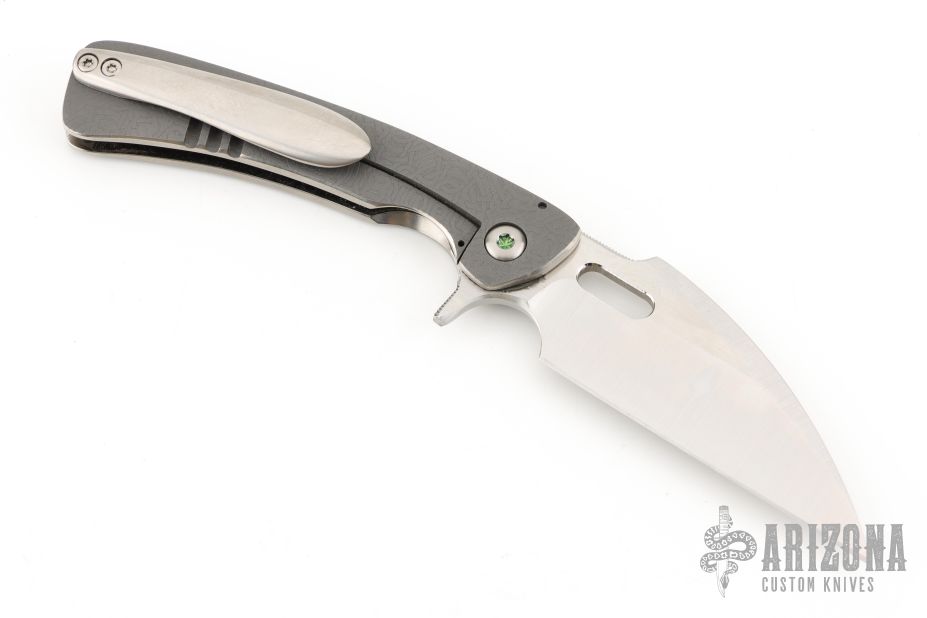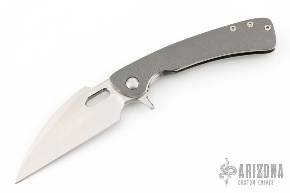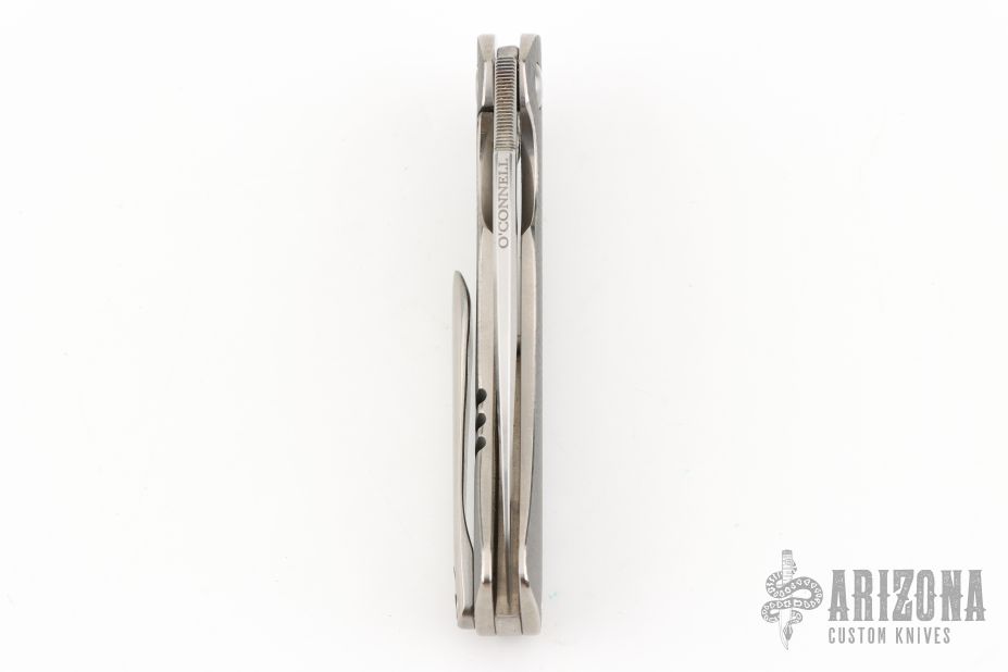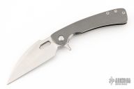 This Rascal by Sean O'Connell features a satin finished wharncliffe blade with false top edge, notched thumbrest, thumbhole and flipper. The handle has a laser engraved titanium frame with a titanium backspacer and tip up clip. Nice detent, lockup and blade seating. Rides on bearings. Comes with a zippered case and COA. Excellent condition.
