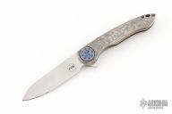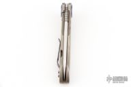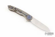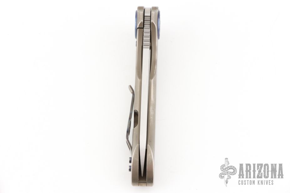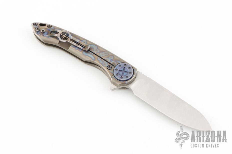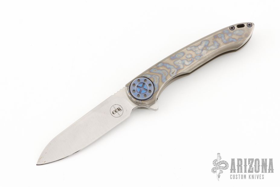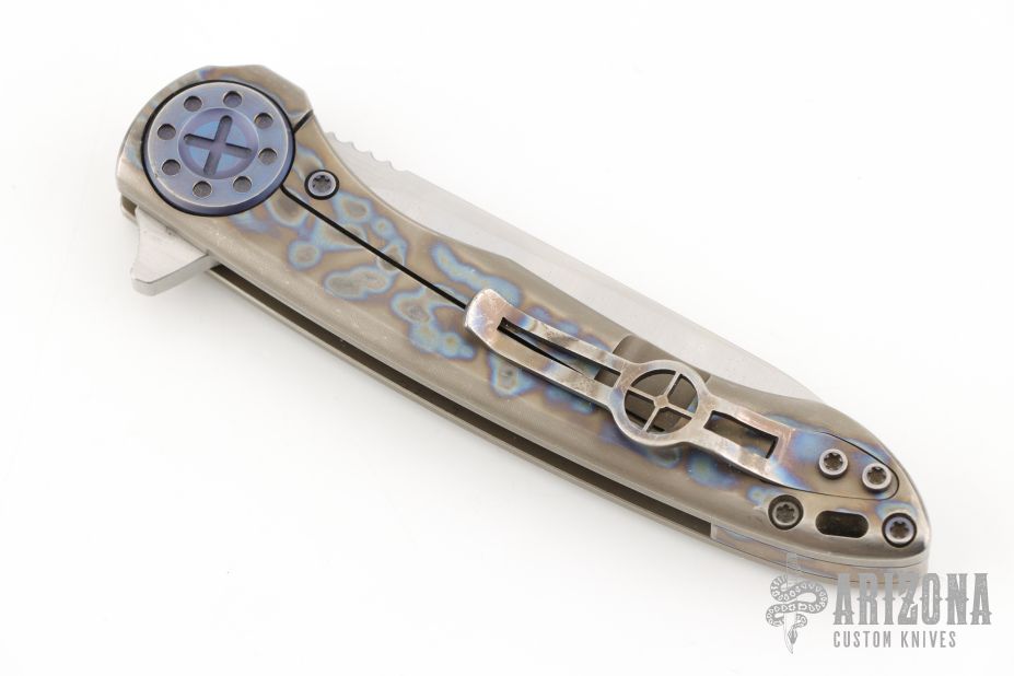 This Cruze Flipper by Curtiss knives features a satin finished blade with notched thumbrest and flipper. The handle has a flamed titanium frame with matching titanium backspacer and tip up clip. Has stainless lockface insert, nice detent, lockup and blade seating, rides on bearings. Has anodized hardware. Comes with a zippered case.  Has scuffs/scratches otherwise the knife is in good condition.