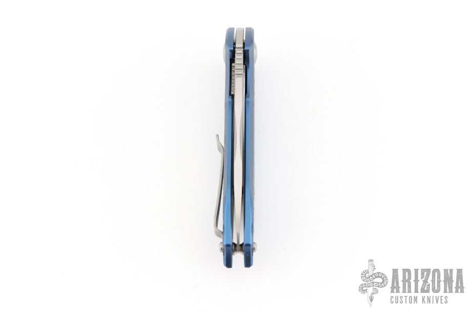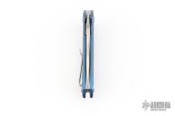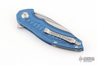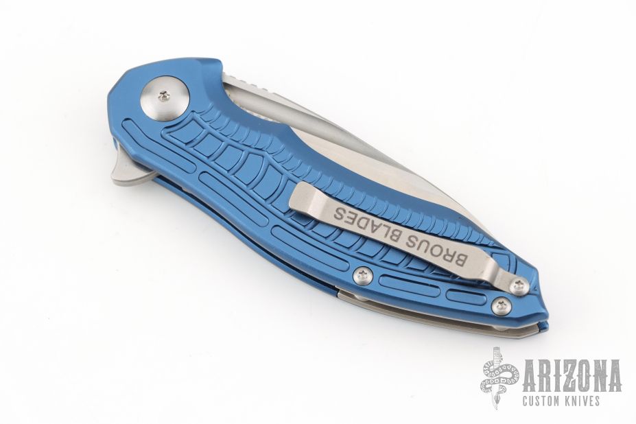 This Bionic Linerlocking Flipper from Brous Blades has a satin blade with fullers and notched thumbrest. The handle has a blue titanium frame with a tip up gray stainless steel clip. Rides on bearings, nice detent, lockup and blade seating. Comes COA.  Excellent Condition.