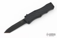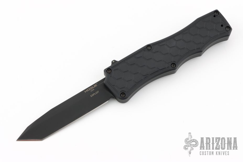 This model of the Hogue Exploit OTF sports a black tanto blade with a black aluminum handle and screws.