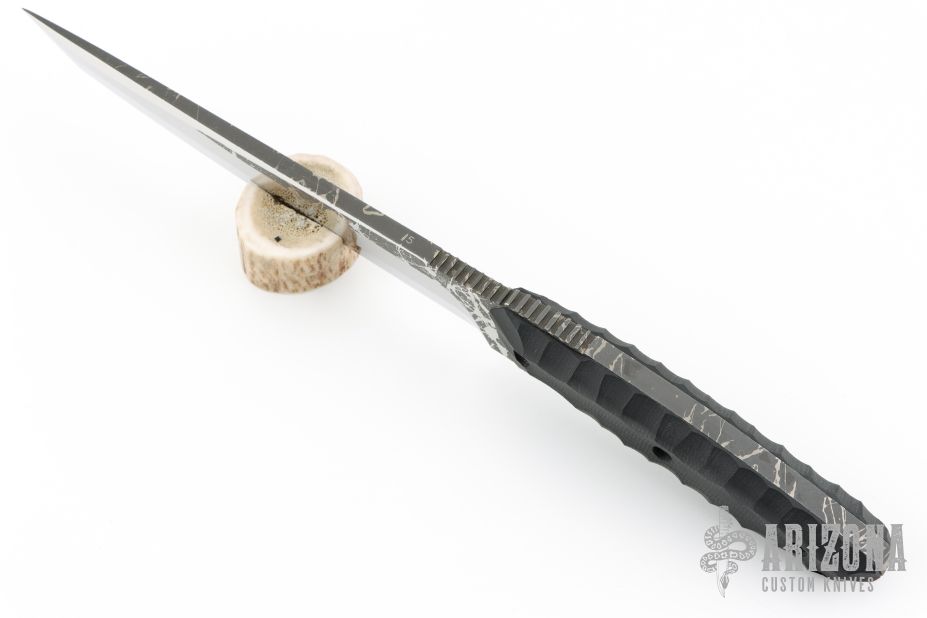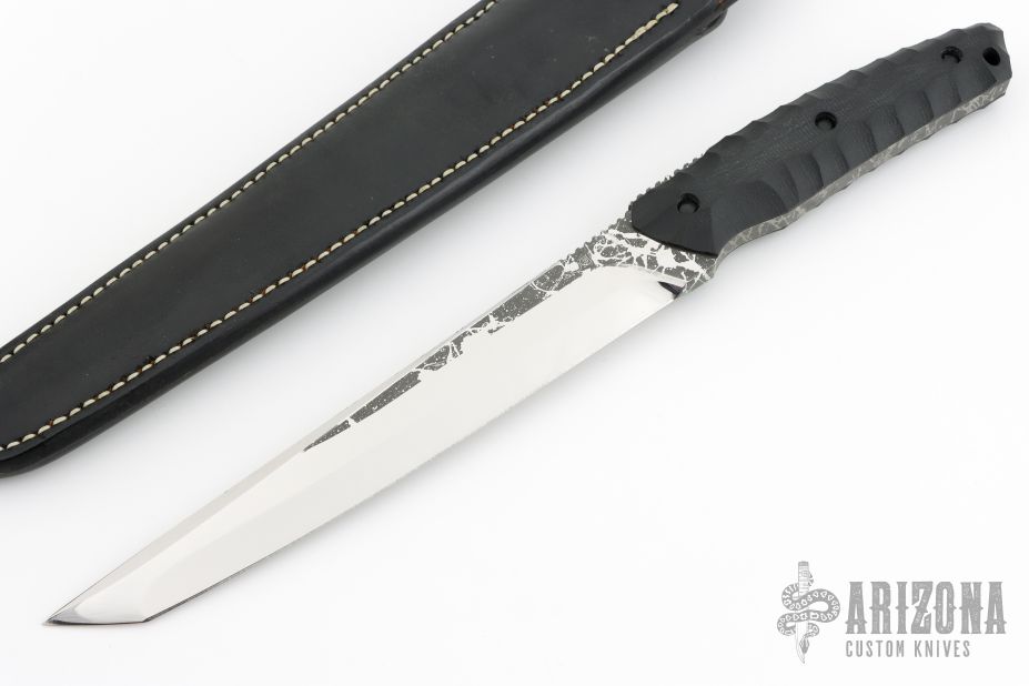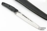 Featuring a mirror polished blade with double bevel lines and grinds, Black Canvas Micarta handle, and OU-31 steel. OU-31 steel It is a micro fine steel made by Nippon Koshuha Steel Co., Ltd. It features high hardness, HRc 64, and is 3 times tougher than that of D2. Reported to have 10 times longer edge holding than ATS-34 according to cutting tests.