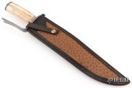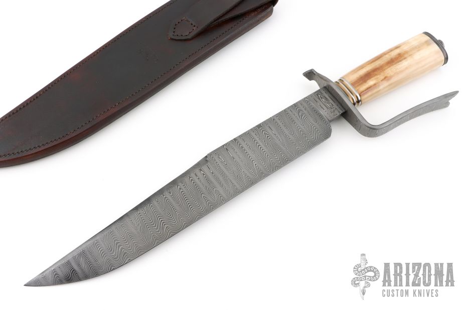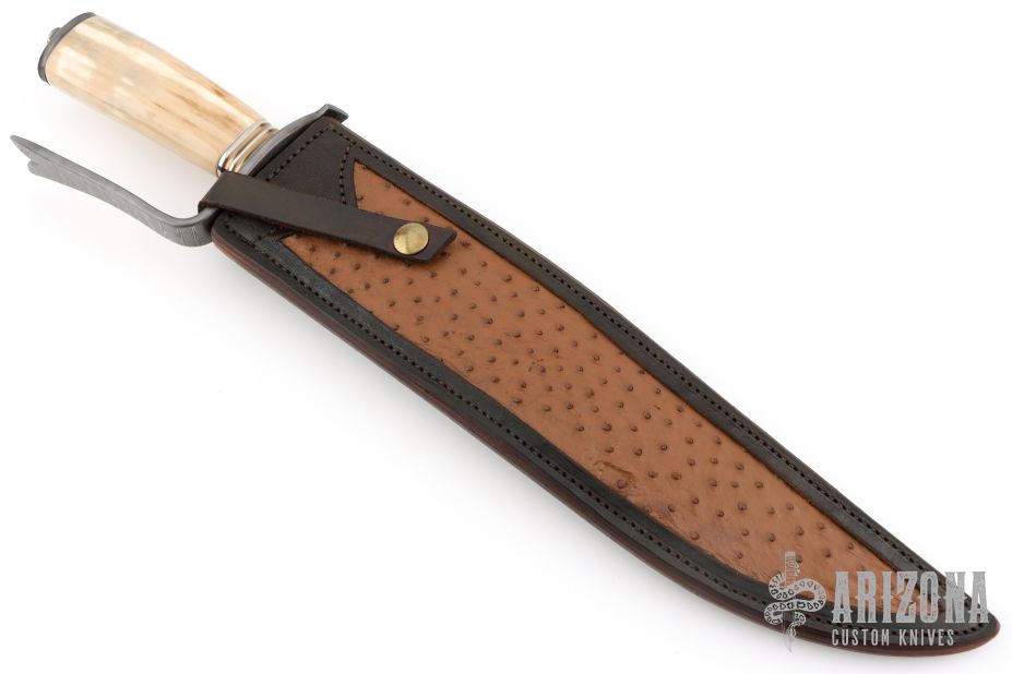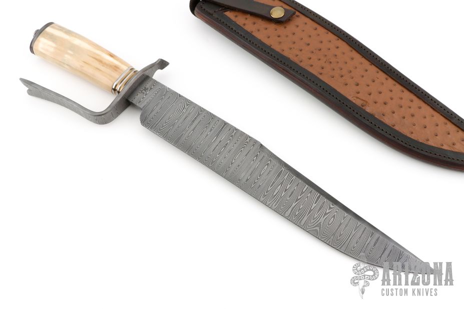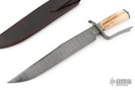 This Bowie by Master Smith J.W. Randall features a Ladder Pattern Damascus blade with a nearly sharpened top edge, .235" blade stock and 1.934" blade depth, hidden tang construction. The handle has a matching Damascus half guard, fluted and heat colored stainless steel spacer, fossil walrus ivory scales, matching Damascus fluted butt with Damascus finial. Comes with a brown leather sheath with ostrich leg skin inlay and a nylon zippered case. New from maker!