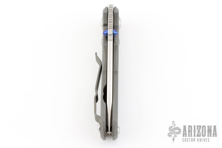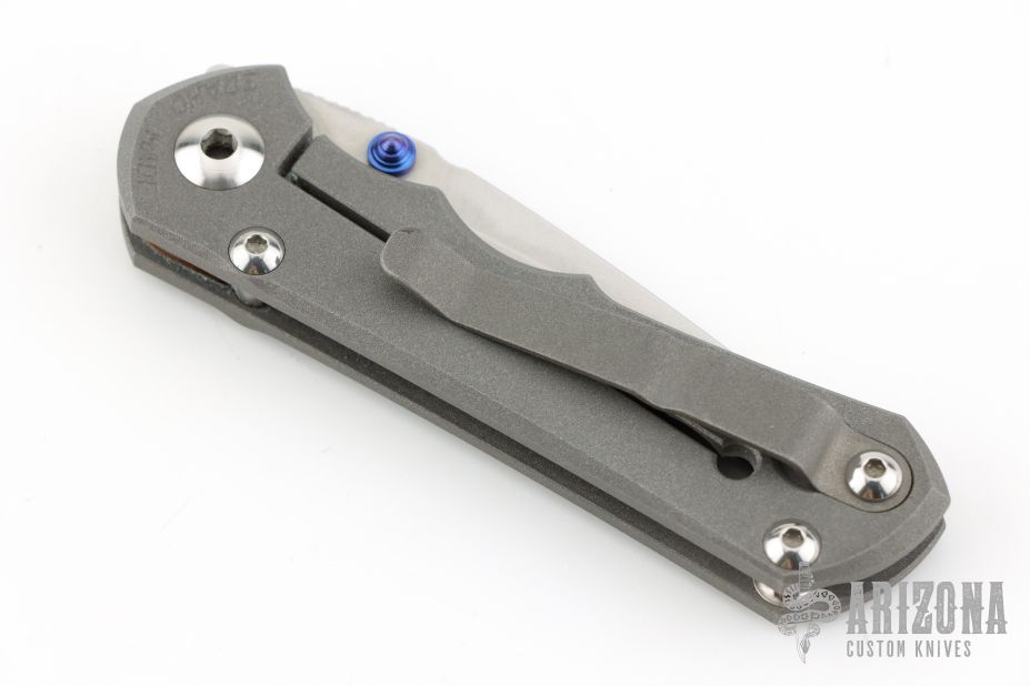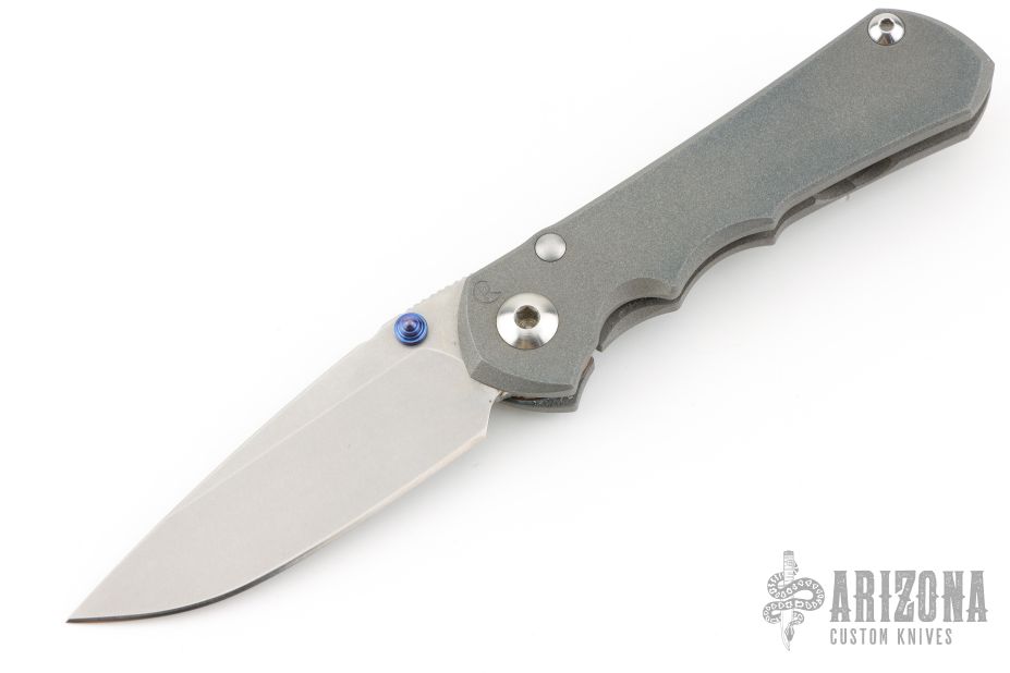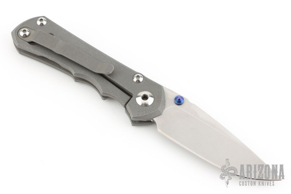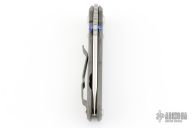 This Small Inkosi from Chris Reeve Knives features a tumble finished drop point blade with dual anodized thumb studs and notched thumbrest. The handle has a bead blasted titanium frame over a single barrel spacer with a matching bead blasted titanium tip up clip. Includes original box, lube, tools, and COA dated January 11, 2022. Has a couple light scuffs, otherwise excellent condition.