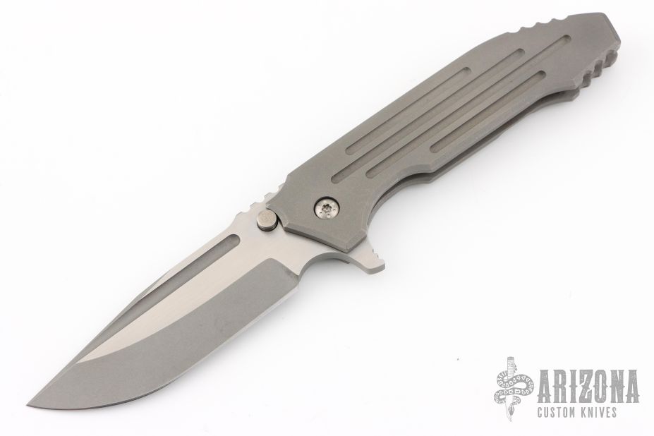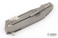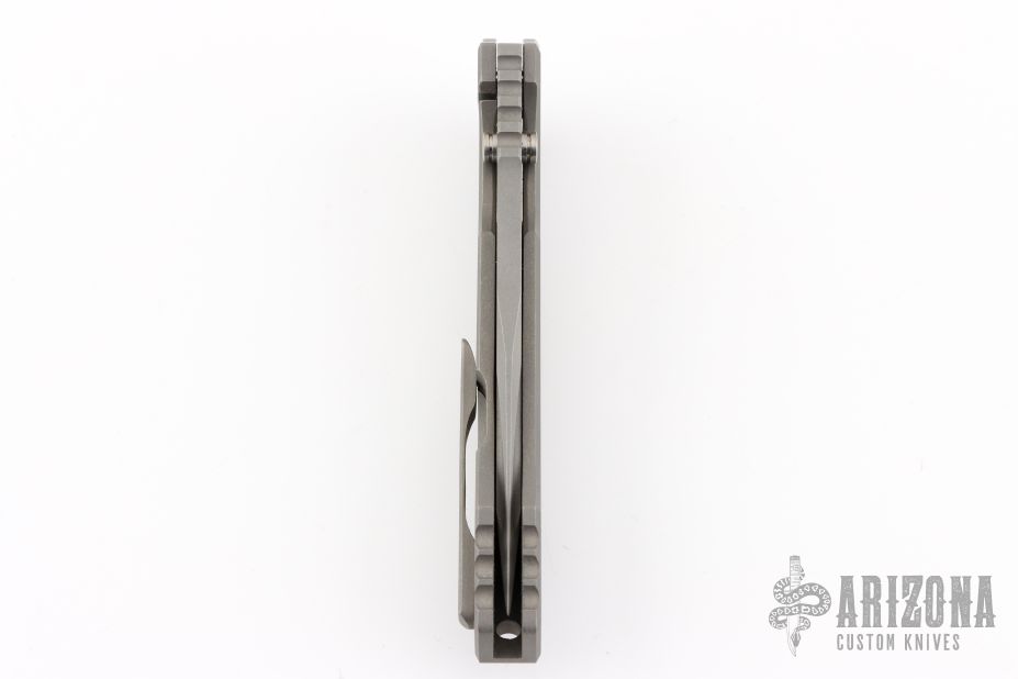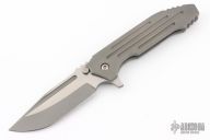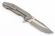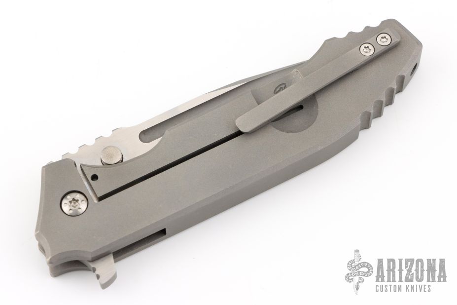 This Peter Rassenti Custom SNAFU integral framelock folder features a 2-tone blade with flipper and dual thumb studs. The integral handle is stonewashed titanium with a tip up carry clip.  Very smooth action, blade is centered and has no play whatsoever when opened. Includes the original box.  Has a few light scuffs on the frame otherwise the knife is in excellent condition.