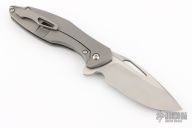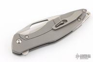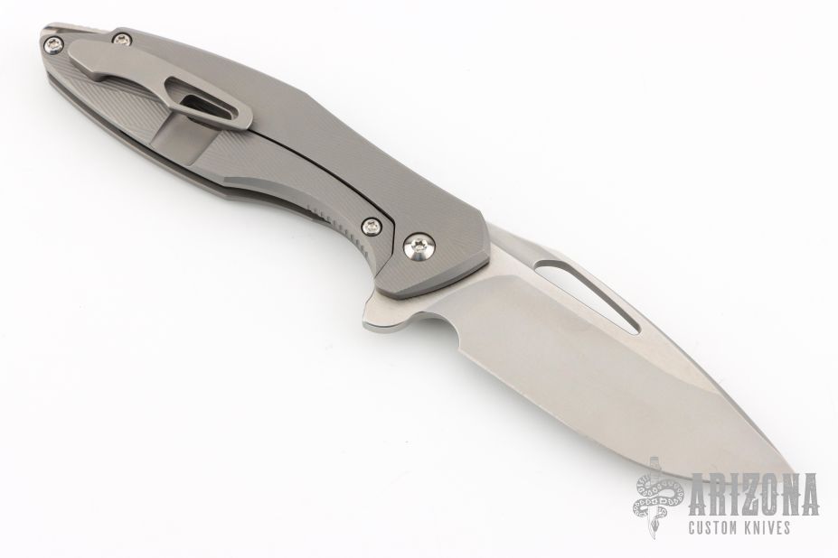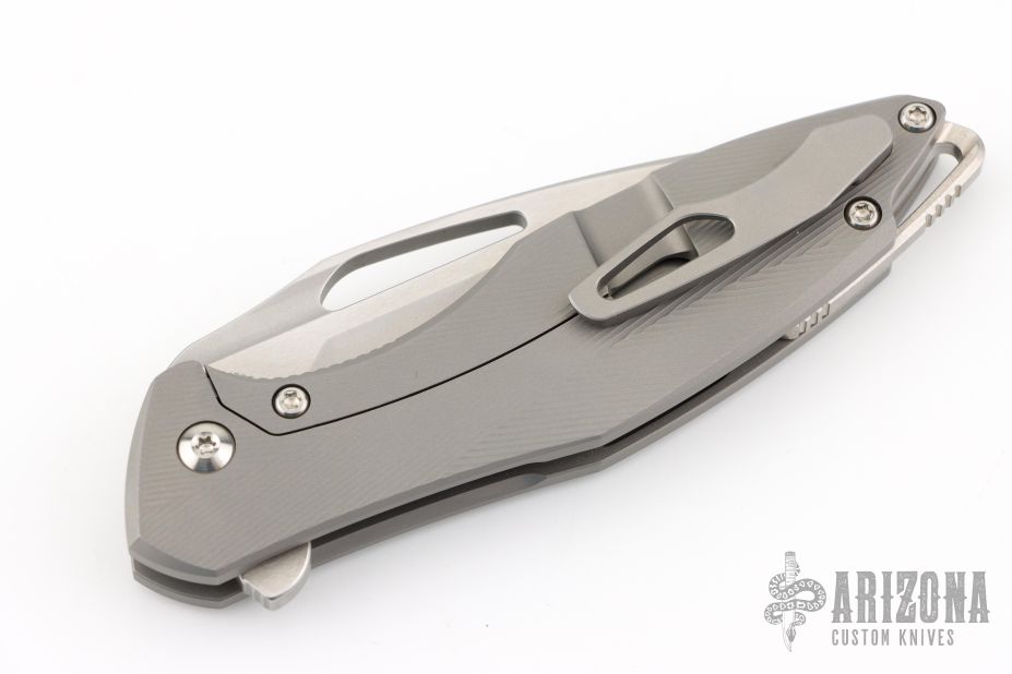 This Mini Arius by Koenig knives features a Burnished w/ PF finished blade with thumbhole and flipper. The handle has a bead blasted patterned titanium frame with a titanium tip up clip, titanium backspacer. Has ceramic bearings and a ceramic detent ball. Nice detent, lockup and blade seating. Comes with original box and COA December 14, 2023. Excellent condition.