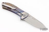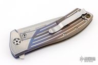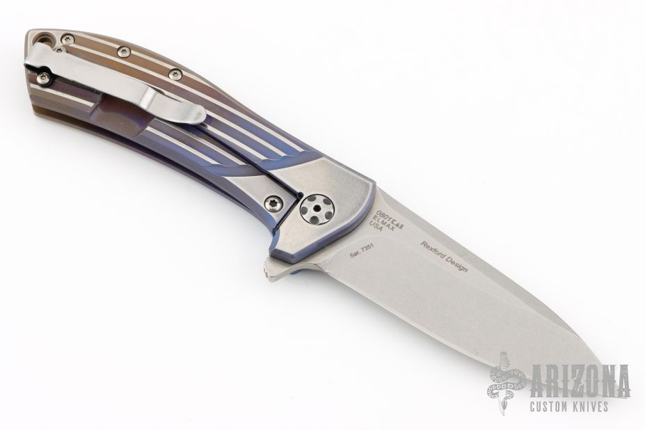 This 0801 Rexford Flipper #7351 from Zero Tolerance has a stonewashed Elmax spear point blade with swedge. Handle is anodized fluted titanium with satin finished stainless steel tip up (RH/LH) clip and lanyard hole.  Comes with original box and paperwork.  Has a few light scuffs otherwise the knife is in excellent condition.