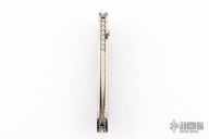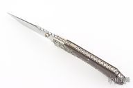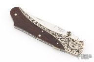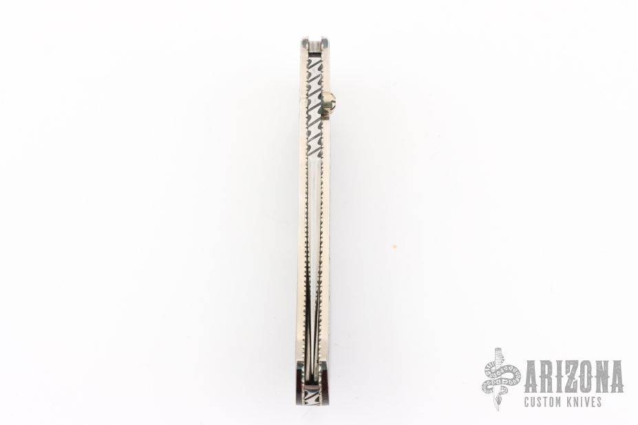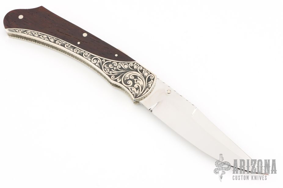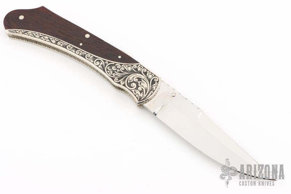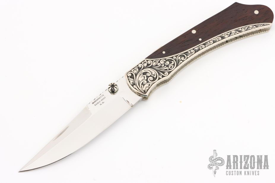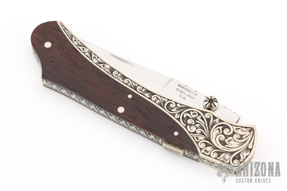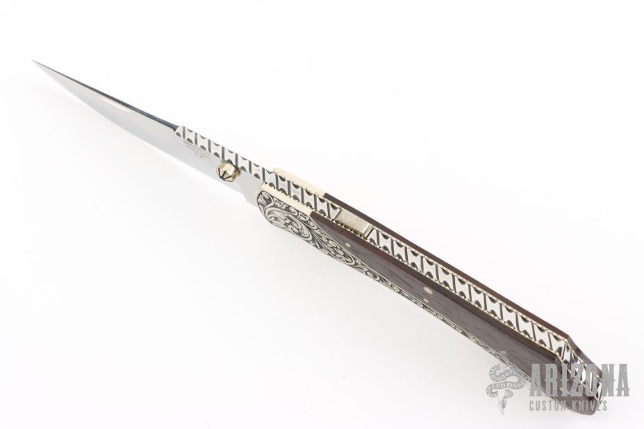 This Midlock by Harvey Otis McBurnette features a mirror polished blade with nail nick, fileworked spine and a single thumbstud. The handle has engraved nickel silver bolsters that extend towards the end of the handle, nickel silver pins, African Blackwood covers, fileworked nickel silver liners, fileworked stainless steel backspacer with notched nickel silver lock release. Nice lockup, function and blade seating. Has a couple light scratches, otherwise excellent condition.