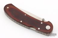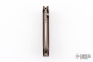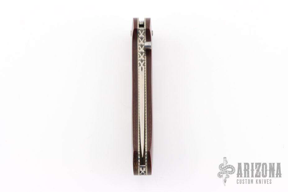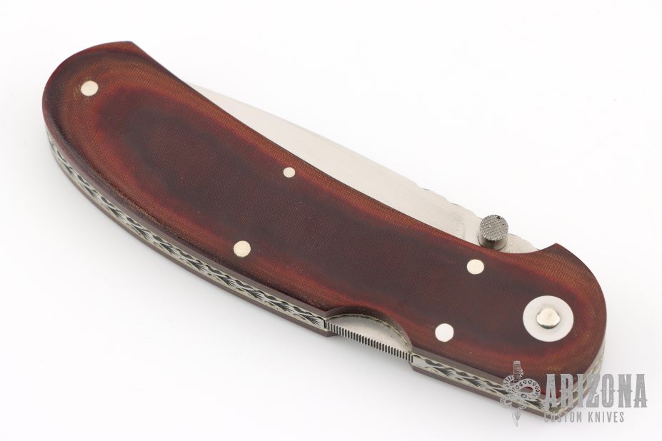 This Midlock folder by Harvey Otis McBurnette features a hand rub satin finished drop point blade with thumb stud. The handle has brown linen micarta covers, file worked nickel silver liners, and a fileworked stainless steel backspacer. Has a couple light scratches, excellent condition otherwise.