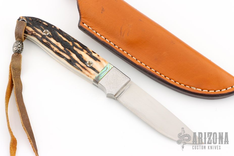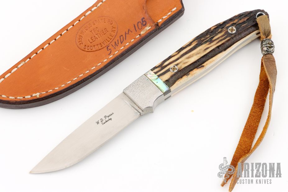 This beautiful drop point sheath knife from Mr. Pease features a hand rub satin finished blade with .147" blade stock and .767" blade depth, full tapered tang construction. The handle has stippled stainless steel bolsters, mosaic pins, stag scales and red and abalone spacers. Comes with a brown leather dangle sheath. Has a couple light scratches, otherwise Excellent condition. "Swdm106" on the blade.