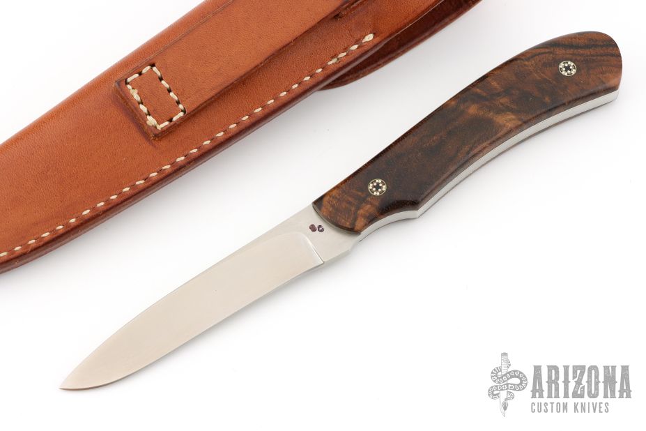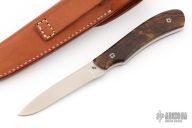 This knife by Scott Costa features a satin finished blade with .154" blade stock and .764" blade depth, full tang construction. The handle has walnut scales with mosaic pins and stainless steel liners, fileworked tang spine. Comes with a brown leather sheath. Excellent condition.