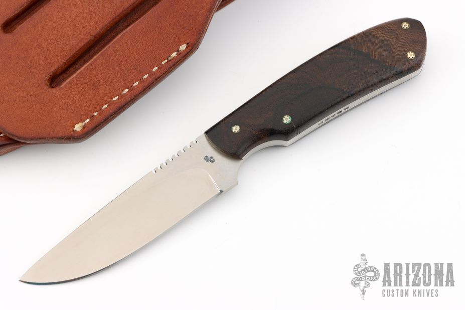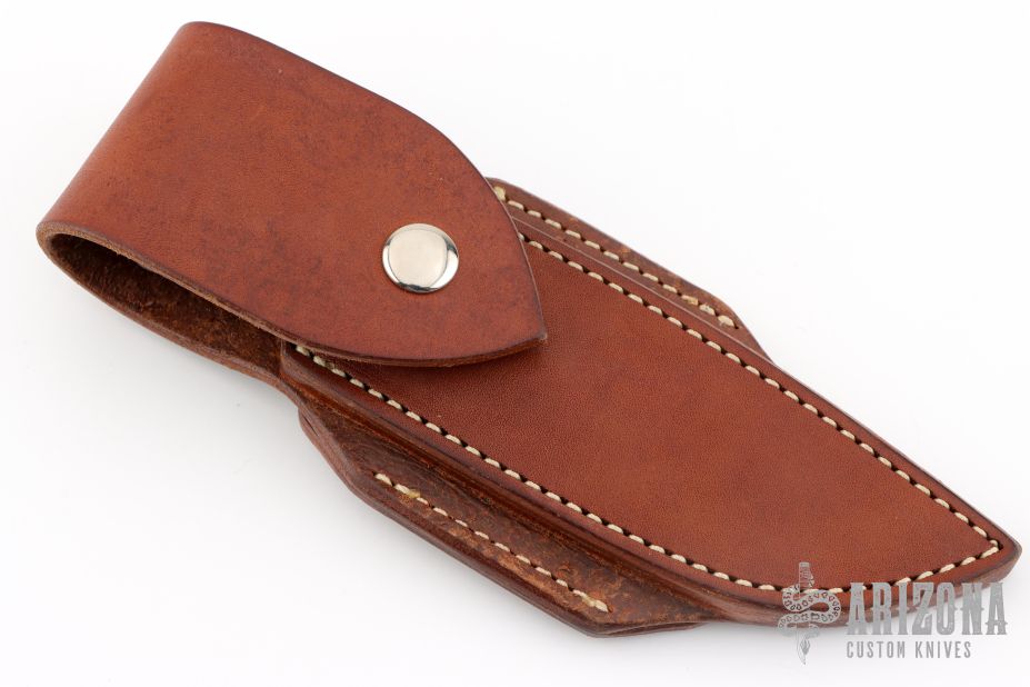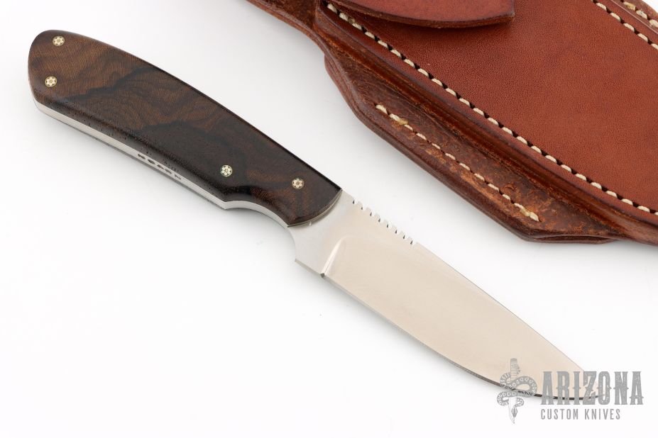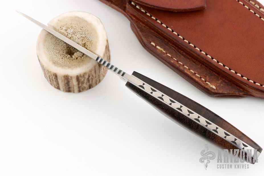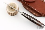 This knife by Scott Costa features a satin finished blade with notched thumbrest, .118" blade stock and .907" blade depth, full tang construction. The handle has walnut scales with mosaic pins and stainless steel liners, fileworked tang spine. Comes with a brown leather sheath. Tang is stamped "26402". Excellent condition.