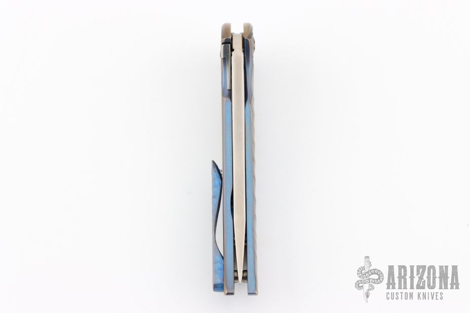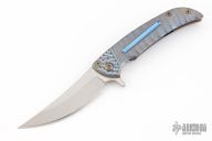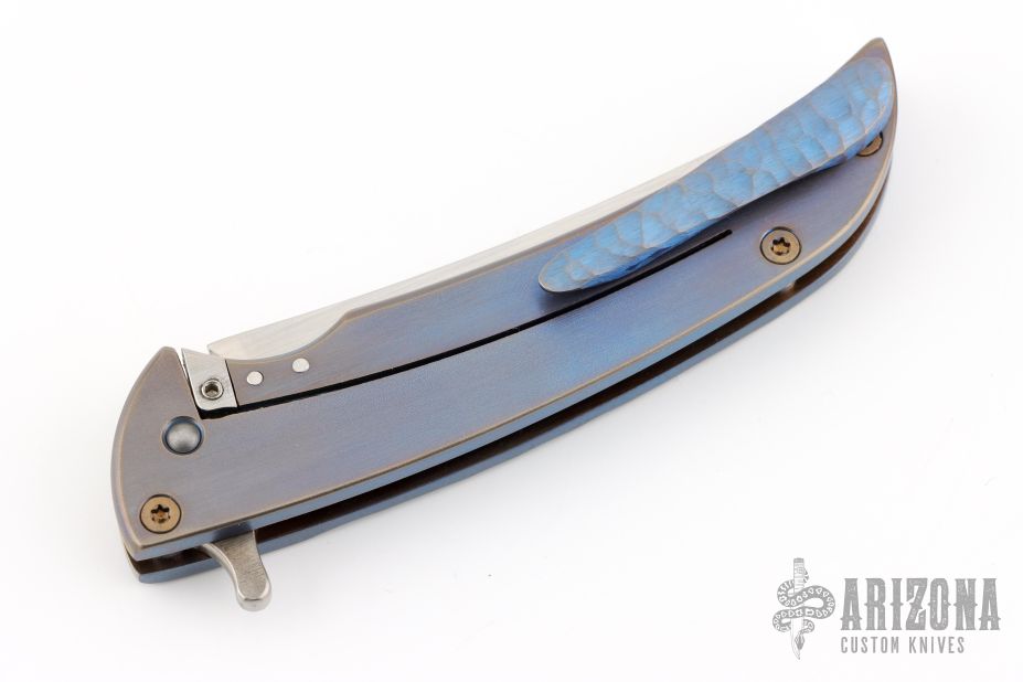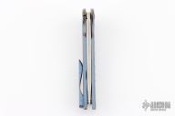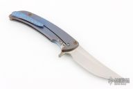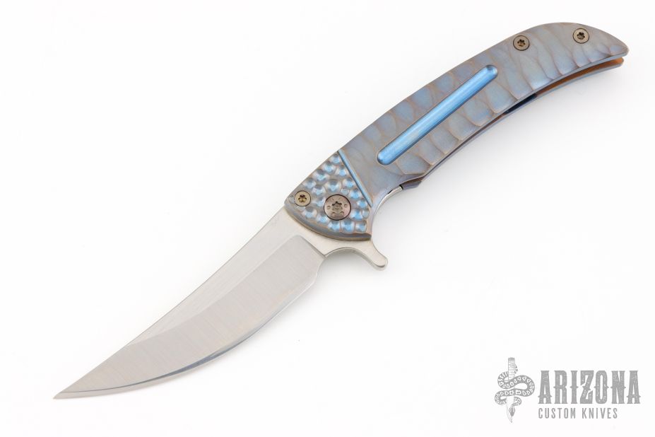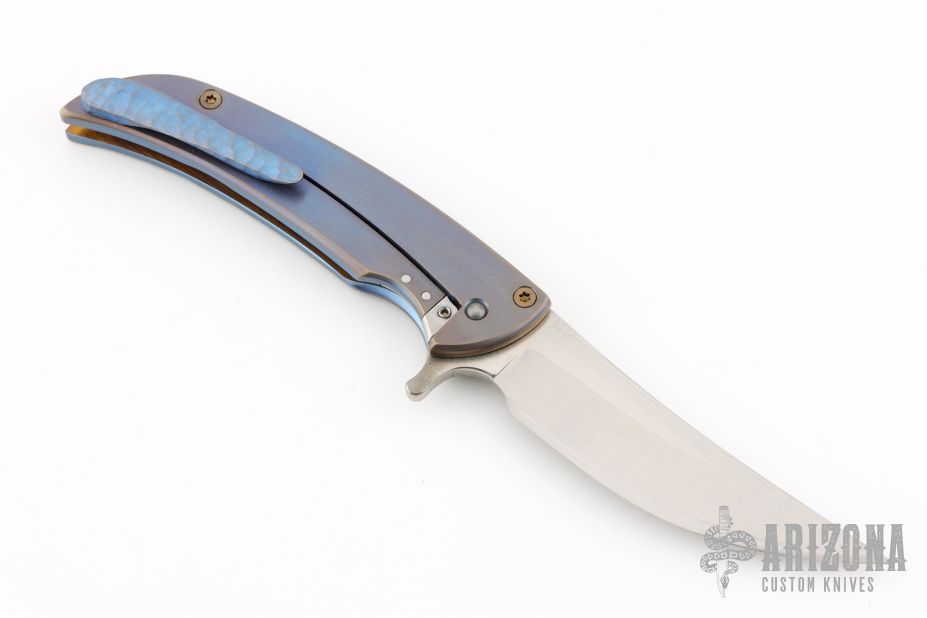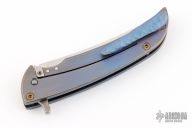 This knife features an up-swept satin finished blade.  The handle has a milled and anodized titanium frame with a matching tip up pocket clip.  Nice detent, lock up and blade seating.  Includes a padded zippered case.  Dated 2014.  Excellent Condition.