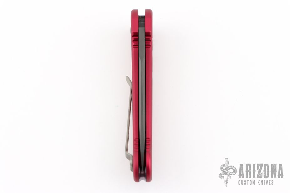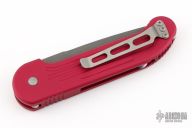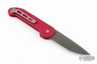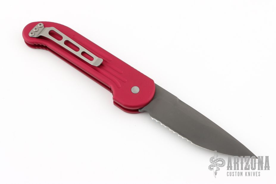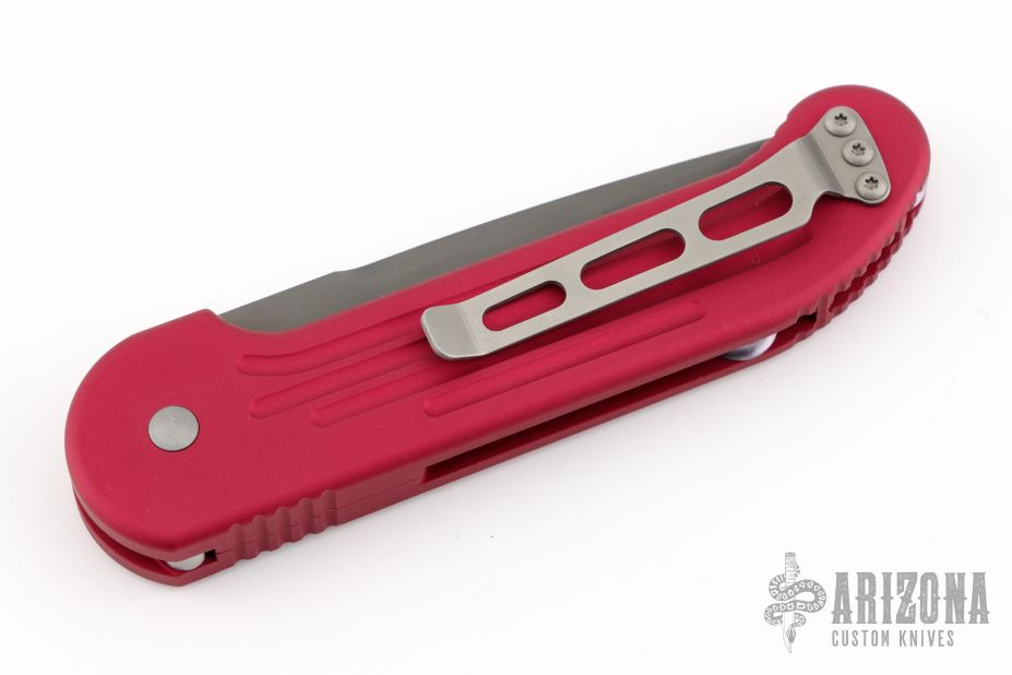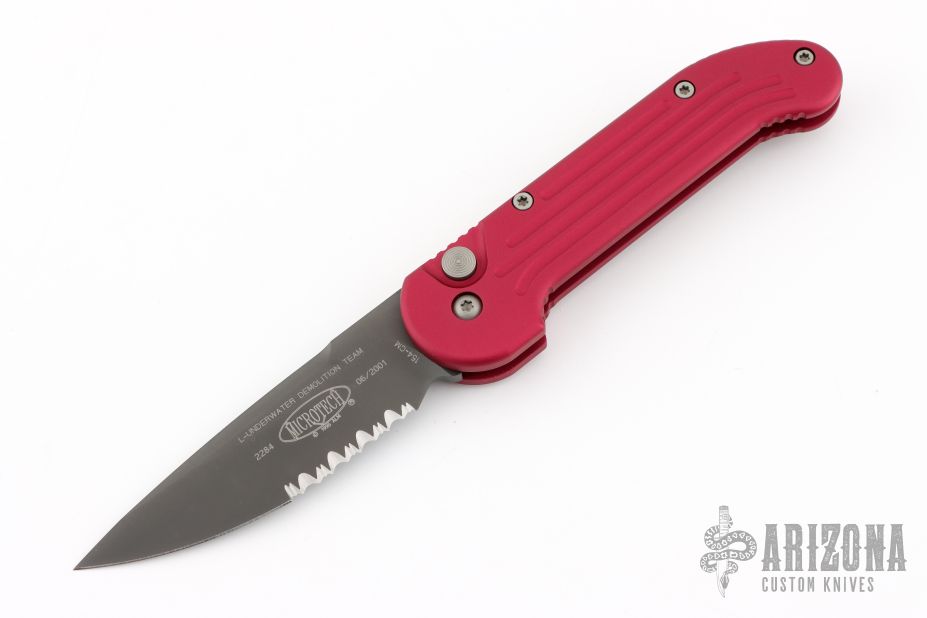 This LUDT by Microtech is dated 06/2001 and #2284. It has a partially serrated black blade. Side opening coil-spring automatic. Red aluminum handle with a tip up bead blasted titanium clip. Includes original box, sheath and paperwork. Excellent/new condition.