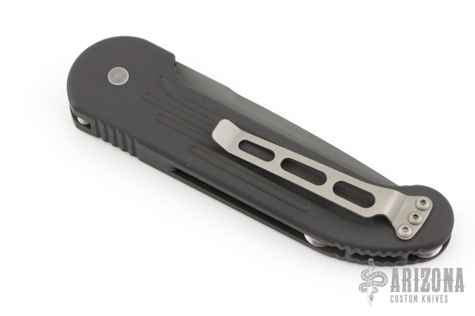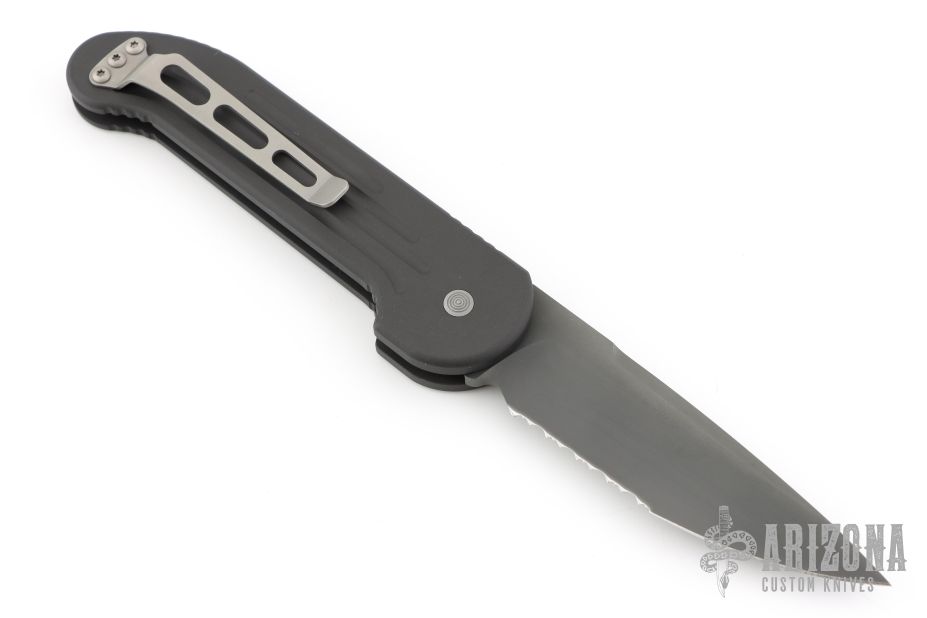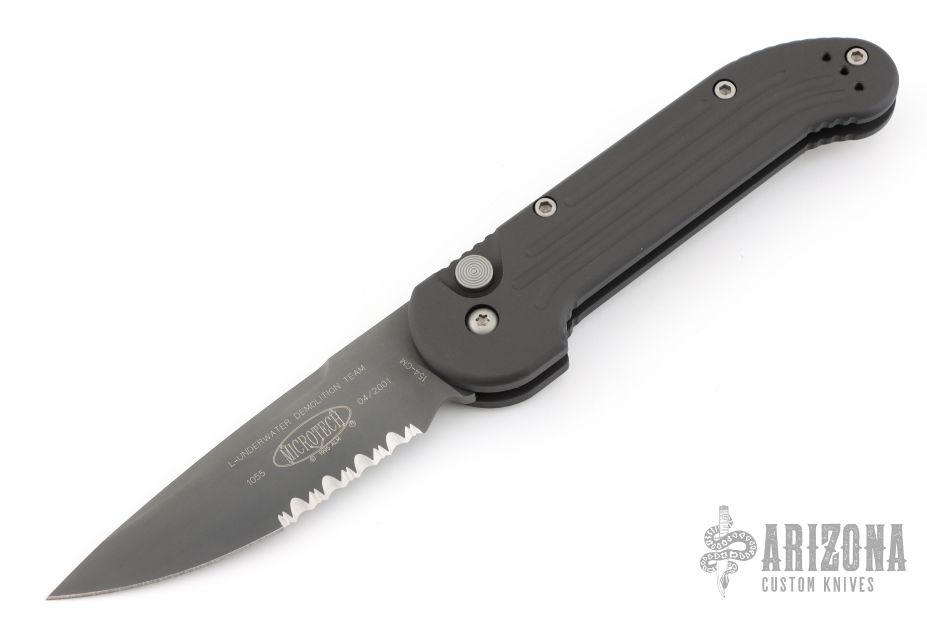 This LUDT by Microtech is dated 04/2001 and #1055. It has a partially serrated black blade. Side opening coil-spring automatic. Black aluminum handle with a tip up bead blasted titanium clip. Includes original box, sheath and paperwork. Excellent/new condition.