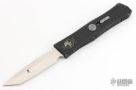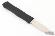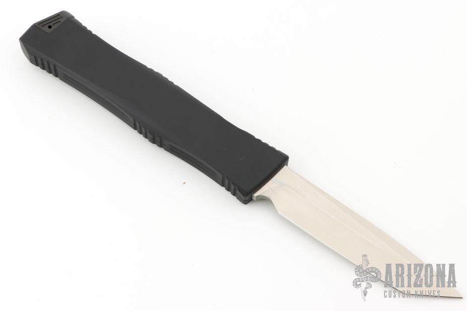 This Exodus by Microtech opens out the front via the automatic push button. Closes by disengaging the leaf lock and pulling the reverse charging handle in the rear of the frame. Contoured frame grip with milled ribbing on the frame spine and belly. This Exodus features a satin finished tanto blade. Dated 11/2004 and #0325. Has a couple extremely light scratches ont he blade, otherwise excellent condition.  Comes with original box, sheath and papers.