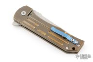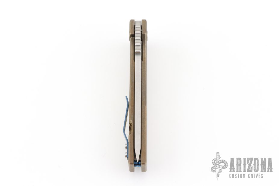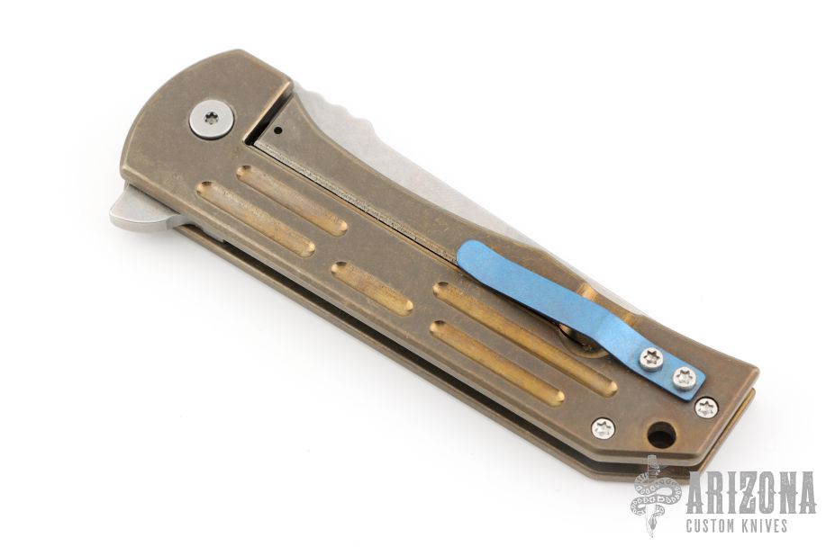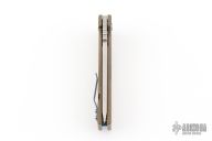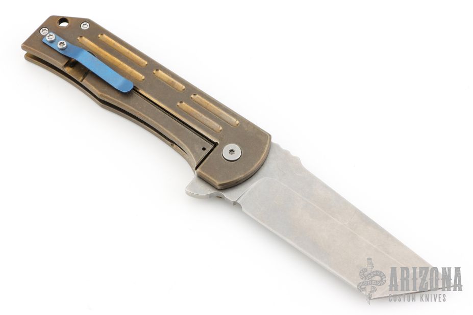 This MidTech F-16 flipper from Robert Carter features a tumble finished tanto blade with notched thumbrest and flipper. The handle has an anodized and tumble finished titanium with frame with custom milled tip up clip. Comes with original bent titanium clip. Blade is centered when closed, strong detent, and locks open with no movement/play. Rides on cages bearings. Excellent Condition.