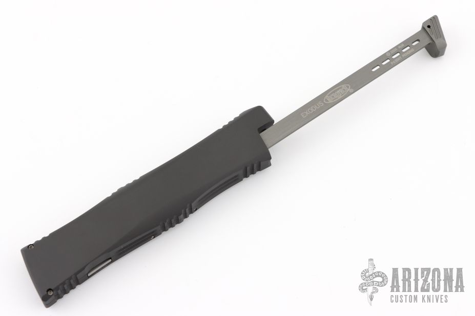 This Exodus by Microtech opens out the front via the automatic push button. Closes by disengaging the leaf lock and pulling the reverse charging handle in the rear of the frame. Contoured frame grip with milled ribbing on the frame spine and belly. This Exodus features a stonewash finished tanto blade. Dated 07/2001. Has a couple very light scuffs, otherwise excellent condition.  Comes with original box, sheath and papers.